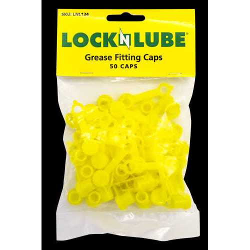 LockNLube brand. Fits all standard grease fittings (SAE & Metric) Integrated collar slides onto the fitting, keeping the cap safely attached. 50 caps LockNLube brand Fits all standard grease fittings (SAE & Metric) Integrated collar slides onto the fitting, keeping the cap safely attached Yellow color 50 yellow caps. Fits all standard grease fittings. 1.67 in. overall length.Inner diameter of cap is 15/64 (fits all standard and metric grease fittings). Eye diameter of the securing loop is 25/64 in. Appropriate for threading onto 1/4″-28 SAE fittings or M6. For larger fittings, such as 1/8″ NPT, the securing strap can be placed over the top of the grease fitting with ample room for the cap to secure as well.
