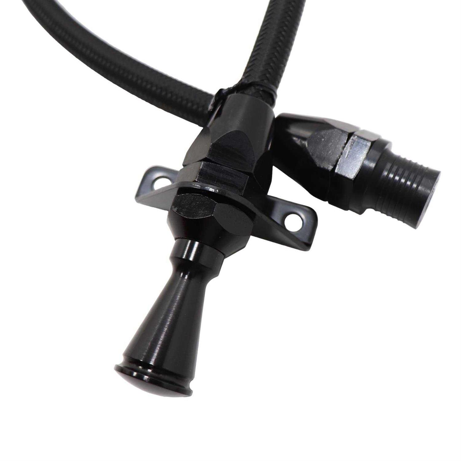 Black Hi-Tech Transmission DipstickSuit GM 4L80E Firewall MountYou have flexibility with our Teflon-lined Flexible Braided Stainless Transmission Dipstick. Kit comes complete with braided stainless outer housing and heat resistant E-Z to Read flexible inner dipstick measuring cable. Inner cable is molded with appropriate trans fluid levels. Billet aluminum handle and billet aluminum fittings complement Lokar’s Flexible Engine Dipsticks. Kit includes dipstick funnel adapter to assist in filling. Applications available for GM,Ford,and Chrysler in both firewall mount and Transmount. The firewall mount dipstick measures 24″in length and is also available in 36″and 48″lengths.Transmount mounts to the bell housing and the length varies according to the transmission application.