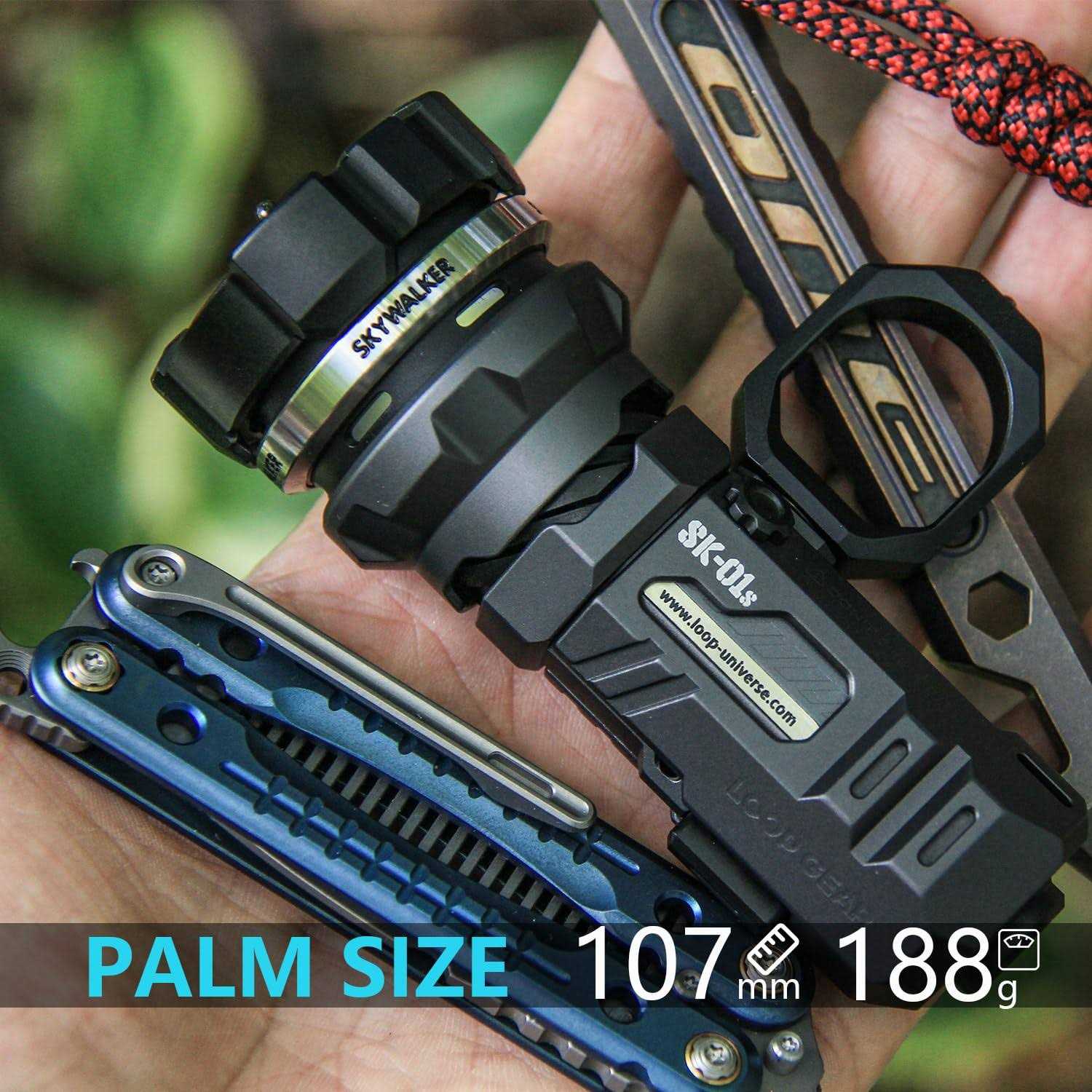 Super Bright:SFT40 LED emits 1600 Lumens lights over the length of about 5 football fields(500 Meters, 1640feet) Rechargeable: Powered by the included battery, with built-in Android Charging port, 16h max runtime Tought and reliable: IP67 water resistant, can be submerse under water for 30 mins, no fear of heavy rain, 1 meters impact resistant, survive with casual drop Innovative desgin: Exclusive bolt structure, Picatinny rail like slidable tactical ring, Radar like spinnable tactical ring, paddle like spinner in the neck, spaceship like appearance Fidget features: Smooth Spinner, Fidgety Bolt Structure, Fidgety Finger Ring LOOP GEAR Rechargeable SK01s LED Flashlight
