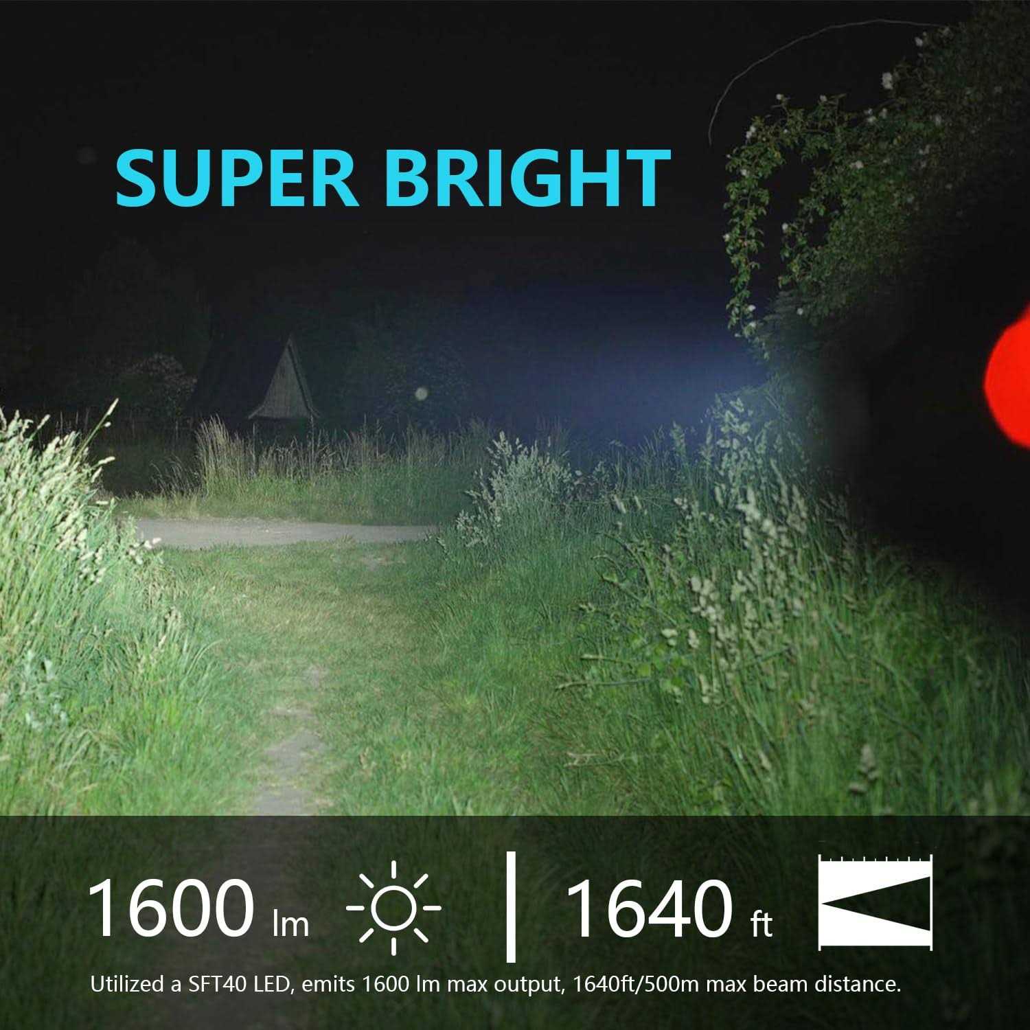 - Super Bright:SFT40 LED emits 1600 Lumens lights over the length of about 5 football fields(500 Meters, 1640feet)