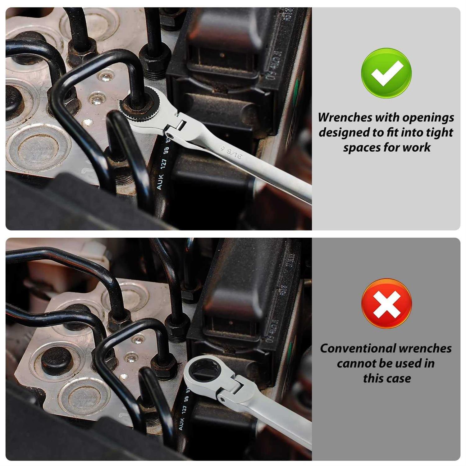 【Professional Tools】Package includes one SAE wrenches of size 5/16. 【HEAVY-DUTY】 Forged from high polished chrome vanadium steel material (CRV) with mirror polish treatment on the surface, corrosion resistance. The use of quenching and forging technology, each step to ensure product quality. 【PATENTED DESIGN】 Ratchet tubing wrench open-end dedsign helps you to reach the tightest places, where most ratchet wrenches would not reach, convenient and quick. It allows for easy access and turning of hard to reach bolts. 【180°FLEX-HEAD & 72 TOOTH RATCHET】The slim profile with 180° flex is specially designed for working in tight spaces. Built-in 72 teeth, turning only once 5° s, easy to use a small space barrier and effortless operation. 【APPLICATION】 This Tubing Ratchet Wrench is used to tighten hexagonal head, square head bolts or nuts, and can be widely used for auto repair and maintenance, mechanic repair, pipeline repair, electrician repair etc.