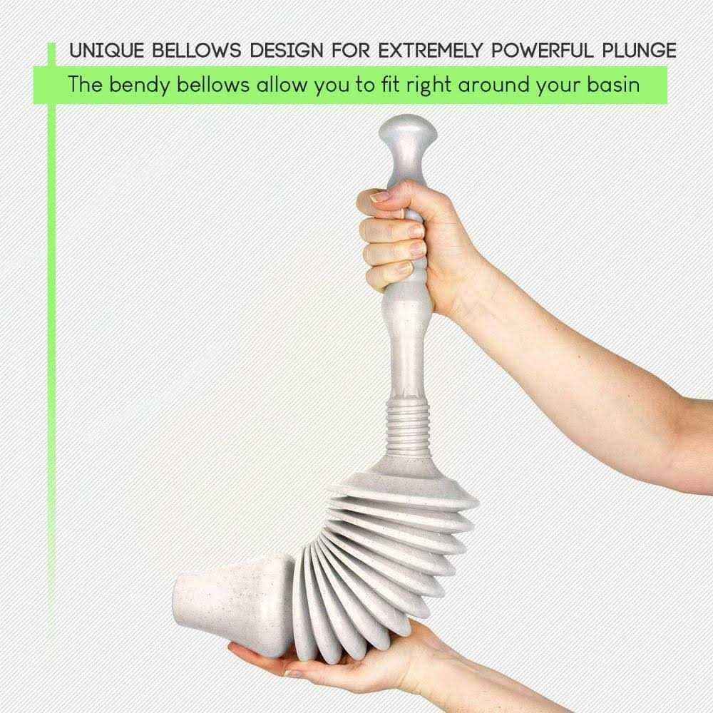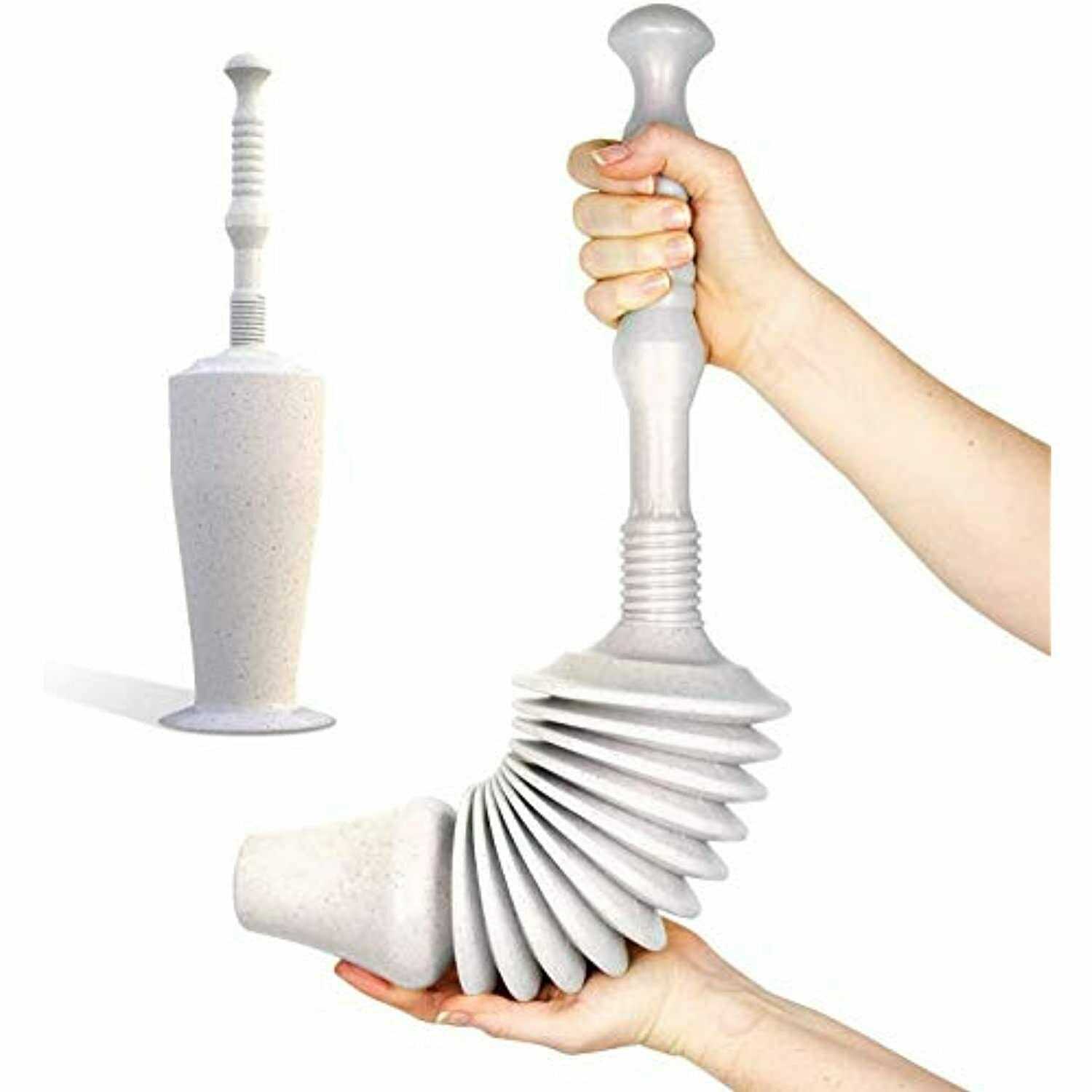 Yes it’s very large but the design is excellent. Two pumps and boom Unclogging has never been easier’ n’Who would have thought a piece of plastic could work so well. This works by vacuum through the accordian style. Better than industrial acid liquid as it doesn’t damage the toilet. Well worth a shot.’ n’Toliet blocked. Other tools didn’t reach around the bend. Simple to use. Must have unblocking accessory.’ n’It could do with a caddy, and cleaning it after use isn’t easy. Other than that it works well, just like commerical bathroom plunger. The handl.