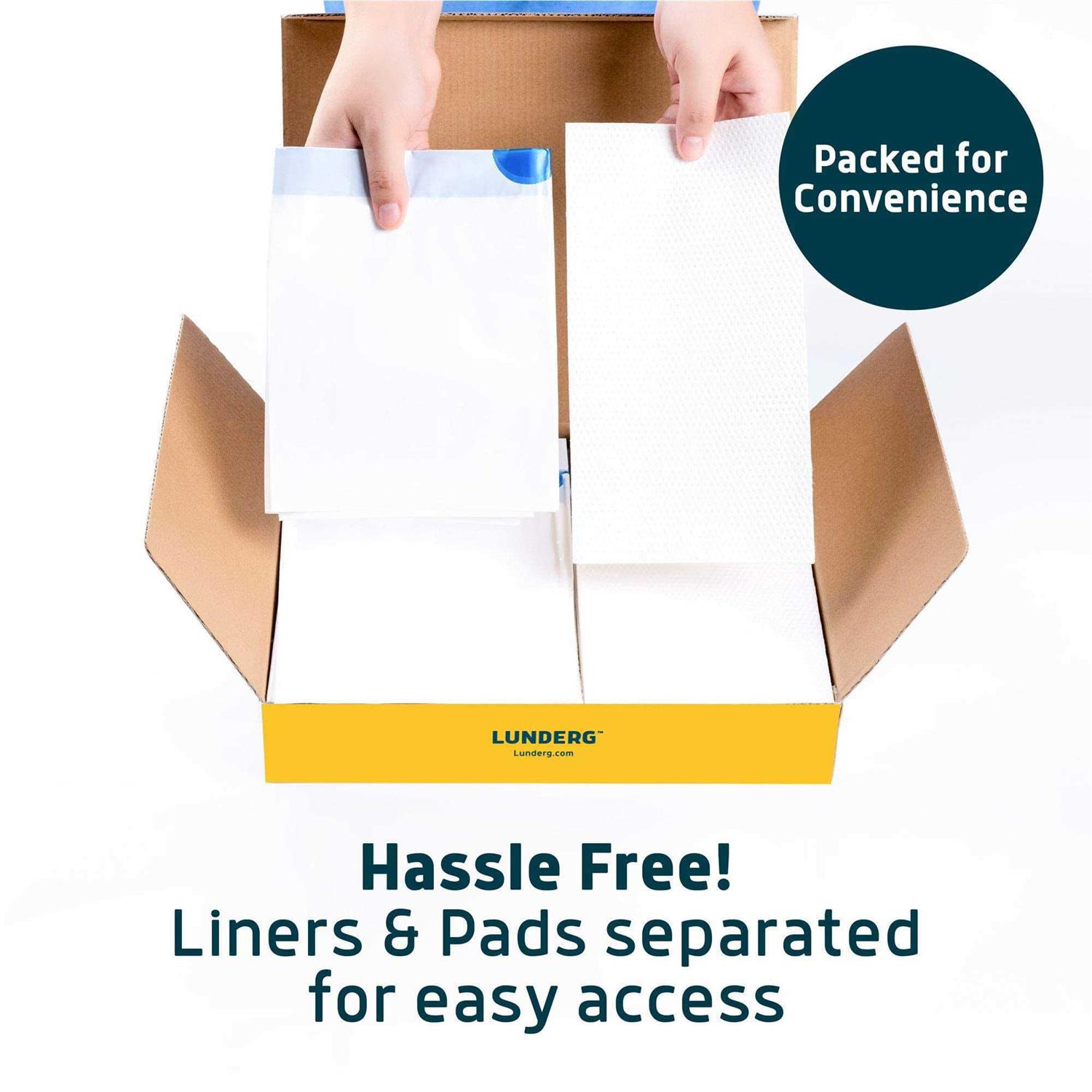 Lunderg Toilet Bowl Liners are specially designed to fit ANY TOILET, like your home, boat, RV, or camping toilet. They are a lifesaver to convert any toilet to a dry toilet within seconds! Our hassle-free bags and pads come in a sturdy box, easy to store with 50 already separated bags and pads. Having them at hand is extremely useful as a sewer emergency can happen at any time. Its better to be prepared than sorry! For your absolute convenience, Lunderg liners dont come in a roll with hard-to-tear perforated edges. Moreover, our lemon scented pads turn water-based & body fluids (up to 35 oz /1000ml) into a gel within seconds while reducing odors efficiently and keeping liquids in control. Simply put, Lunderg liners and absorbent pads make your life so much easier.