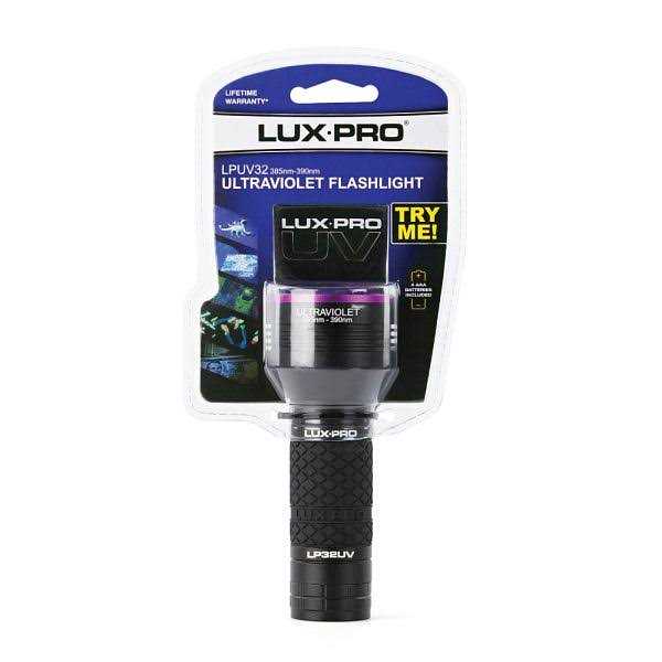 LUXPRO The LUXPRO Ultra Violet 32 LED Flashlight shines bright ultraviolet light. This portable black light can be used for locating scorpions, detecting pet stains, mineral lighting, charging glow-in-the-dark fishing tackle, etc. It features 32 super bright UV LED lights and is made from high-quality aircraft-grade aluminum for durability. Security teams use these lights to detect fraudulent IDs and counterfeit money. Rock enthusiasts use them to find exotic seashore fragments. The LP9UV ultraviolet flashlight comes loaded with 4-AAA batteries and includes a wrist strap.