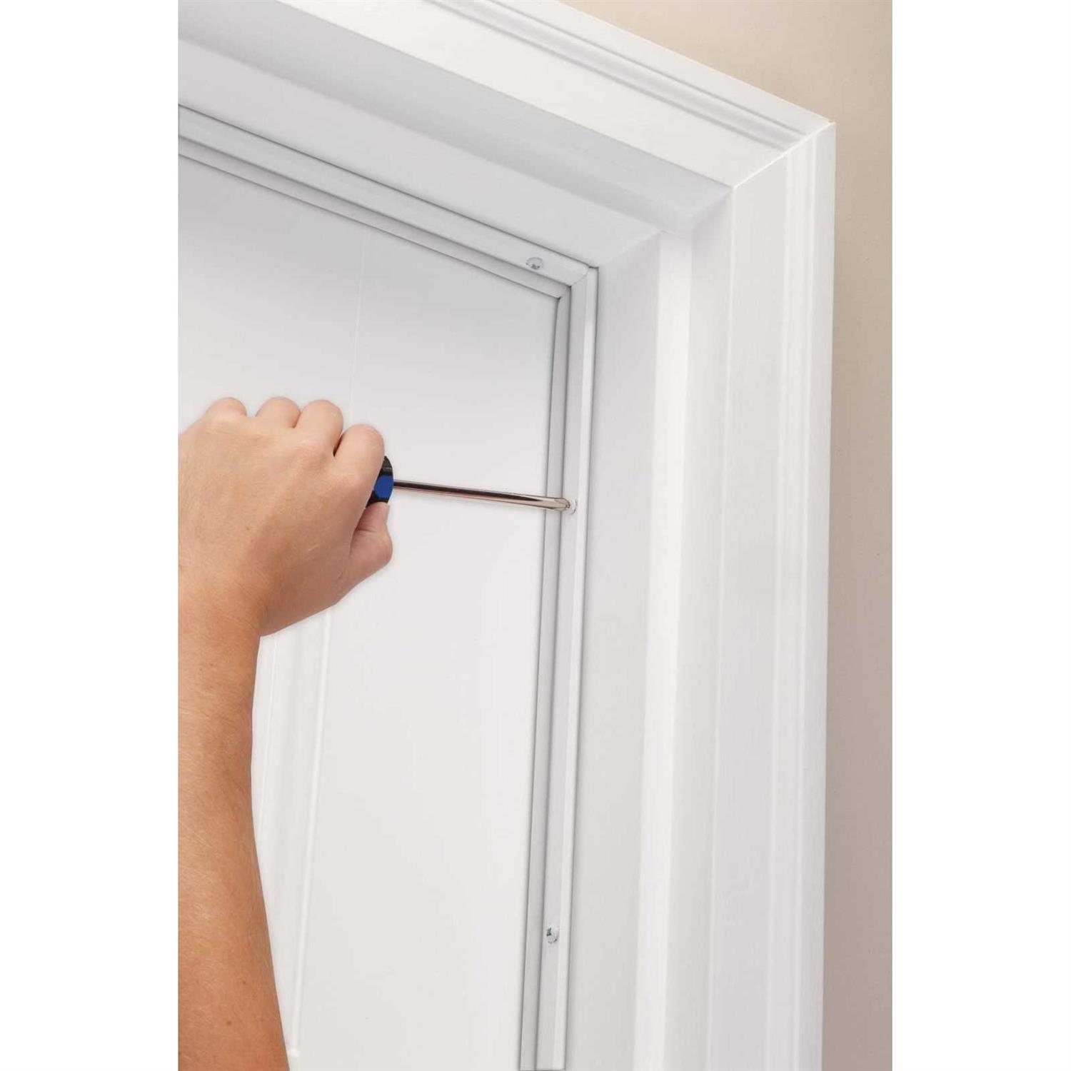 Made of aluminum and vinyl. Nail fasteners for wood frame doors, screw fasteners for wood or steel frame doors. Fasteners included. Install on doorstop. Slotted fastener holes provide easy installation and adjustment. Includes 3 pieces.