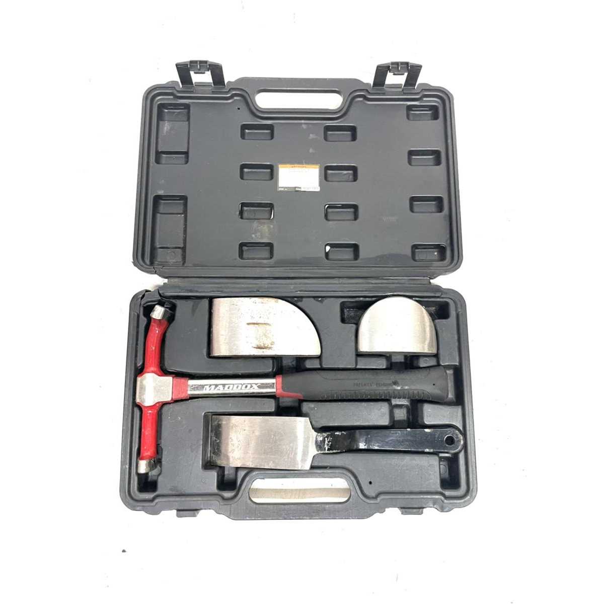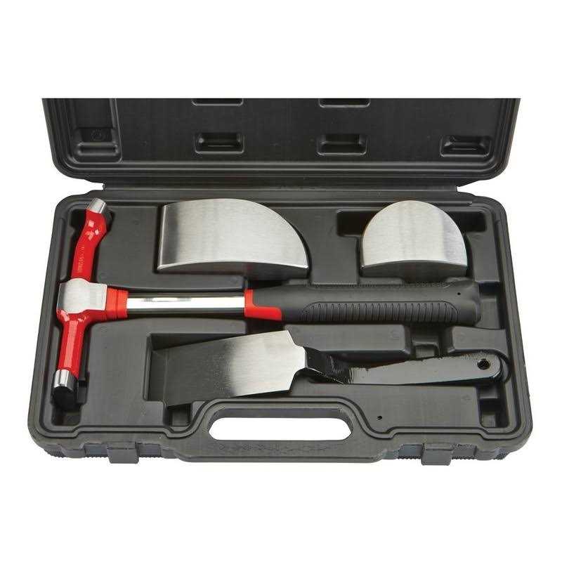 This comprehensive door skin repair kit gives you all the tools necessary to repair and replace door skins and fix dents. The door skin hammer is made of forged, ground and polished alloy steel with a cushion grip fiberglass handle to absorb shock. The durable steel dinging spoon will stand up to blow after blow. Heel and toe dollies are also included.