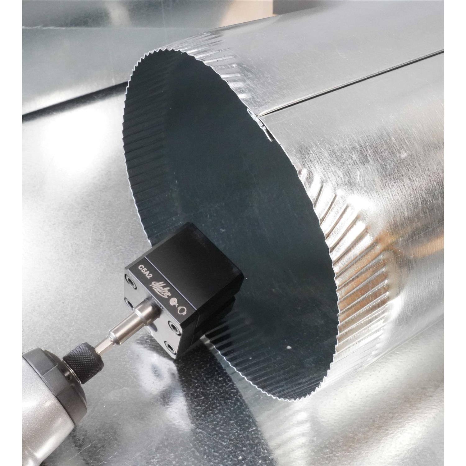 The Malco TurboCrimper IMPACT is a simple, compact accessory that works exclusively with the power assistance of impact driver technology to safely and efficiently crimp 30 to 24 gauge (0.41 to o.71 mm) galvanized round duct and (0.31 to 0.61 mm) black stove pipe. Based on actual field trials, the TurboCrimper Impact is 78% faster than using a manual sheet metal crimping tool! The TurboCrimper IMPACT does not require set-up or adjustment. Just chuck the 1/4 inch power groove drive shaft to your cordless or corded (Min.12 Volt DC / Max. 7 Amp AC) impact driver to immediately begin crimping multiple sizes, types and thickness of pipe and duct, including spiral duct, fast and easy. With the pipe or duct seam in closed position, start the crimp to one side of the seam by gently tugging on the driver trigger and angling the TurboCrimper IMPACT onto the metal edge. Walk the crimper around the pipe circumference in a controlled manner and then angle the crimper off the metal as the crimper approaches the other side of the seam. The TurboCrimper IMPACT is five times faster than a manual crimping tool based on actual field trials! It is comfortable for any operator to maneuver and, lefties take note, it works with the impact driver in forward or reverse. The handy little TurboCrimper IMPACT is a must-have accessory for every HVAC installer and easily stores in a ready tool pouch or bag when not in use.