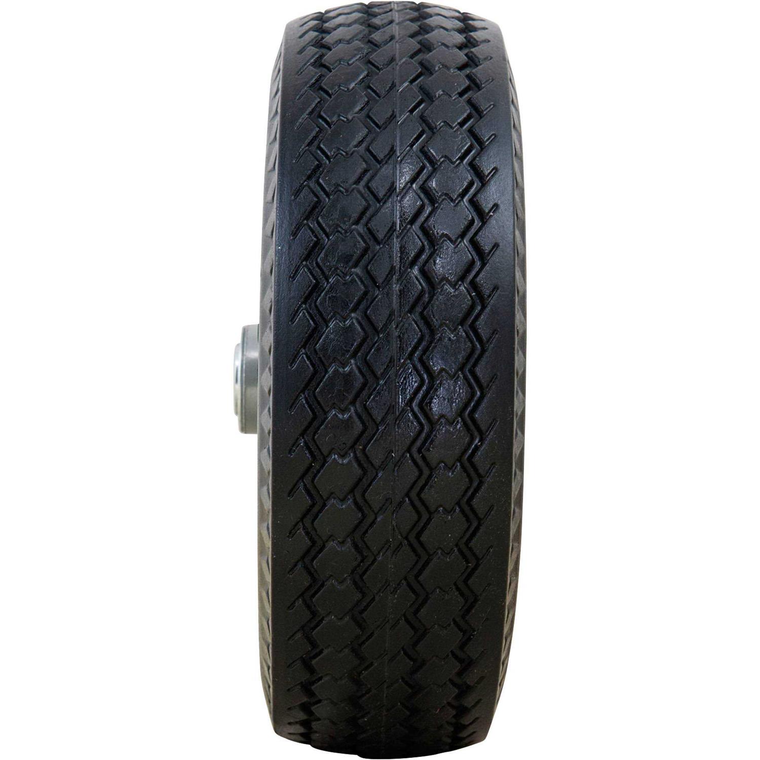 Save both time and money with reliable, bulletproof solid tires. Flat-free tires keep your equipment rolling over the toughest conditions any jobsite can throw at you, eliminating costly and inconvenient flat tires. These flat-free tires have the bounce and feel of pneumatic tires without ever getting flat. Load handling characteristics are similar to air-filled tires, except now troublesome flat tires are a thing of the past. This is the perfect replacement tire for hand trucks performs like an air tire with NO FLATS! Lightweight, solid polyurethane tire is mounted onto a 4in. steel rim, with 2.25in. offset hub, 3/4in. bearings and grease fitting. Tire is nonmarking and has the bounce and feel of a pneumatic tire without ever getting flat Perfect replacement tire for hand trucks Solid flat-free tire is mounted onto a strong 4in. steel rim No more flats Model Number: 00011-NTE. Age Group: adult.