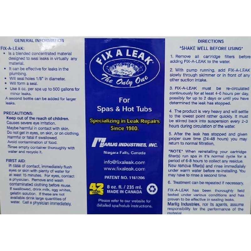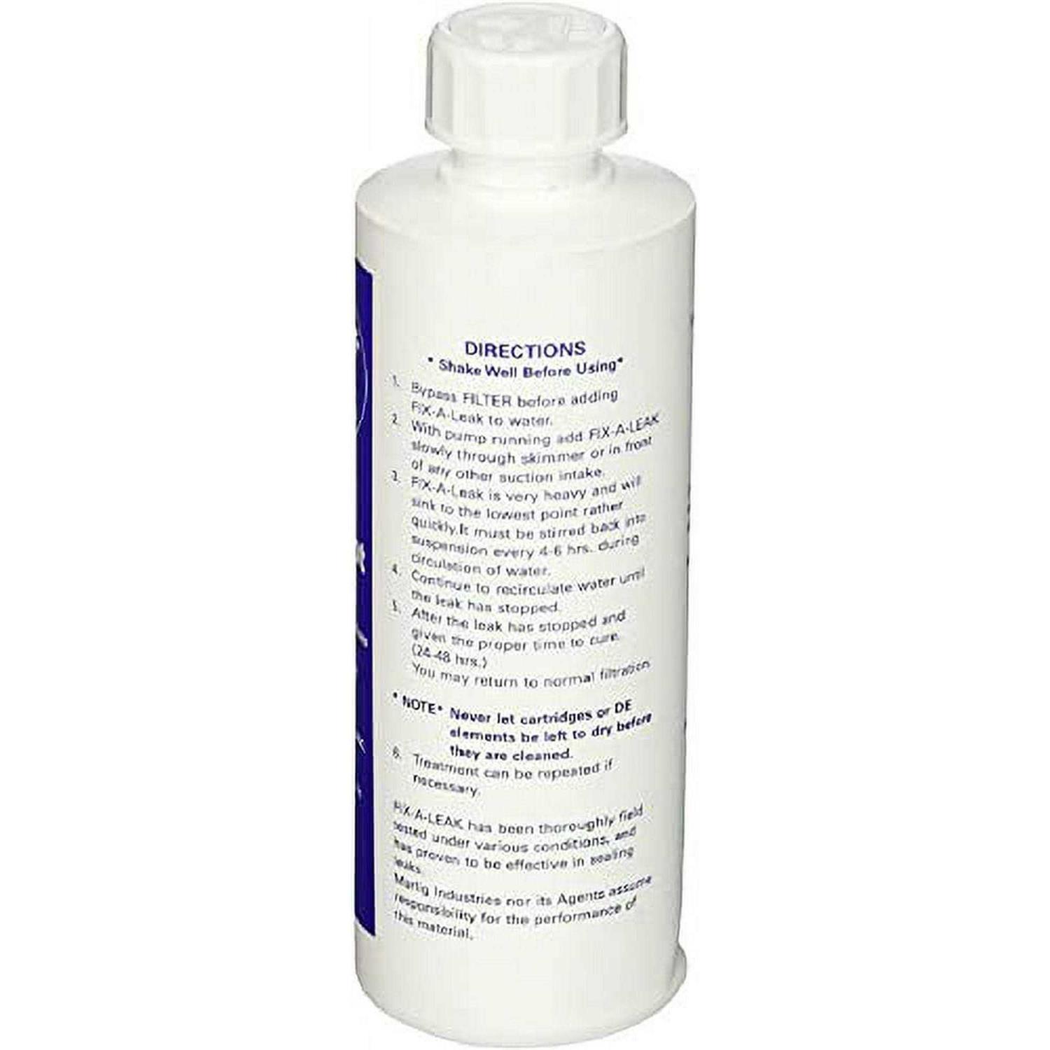 Fix-A-Leak is a blended concentrated material designed to seal leaks in virtually any material. It can be applied for leaks in the shell and works equally well in plumbing. Fix-A-Leak will seal holes 1/8 inch in diameter and will form a permanent seal. Use 1 quart per pool up to 22,000 gallons. Do not use in excess of 1 quart per 5,000 gallons of water.