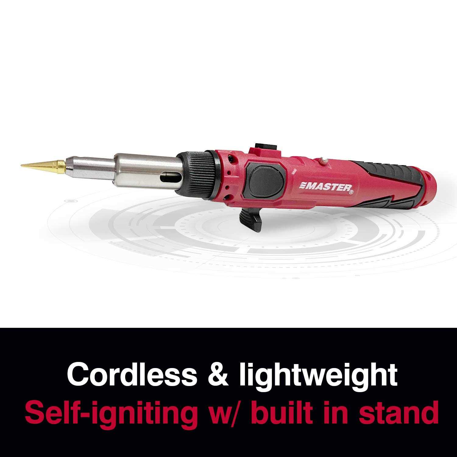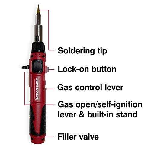 CONVENIENT & VERSITILE: Our handheld self-igniting soldering iron has a lock-on switch and gas control lever, as well as a built-in stand for convenient use and safe cooling of the tool; the kit also comes with lead-free solder LIGHTWEIGHT & PORTABLE: Take our cordless soldering iron with you anywhere to get those tough jobs done; butane powered and refillable, it lasts up to 60 minutes on a full tank (Master Appliance Ultratane Butane fuel sold separately) READY FOR ALL YOUR WORK: This soldering kit includes 4 interchangeable soldering tips, including a hot knife to cut plastics, as well as an open flame function; use for circuit boards, electronics repairs, automotive and marine wiring, home DIY soldering projects, jewelry work and more ADJUSTABLE TEMPERATURE OUTPUT: The adjustable tip temperature ranges from 680F to 820F, ensuring you get the right amount of heat for any application Slowly Pull Ignition Lever to allow gas to flow from tank to the tip for easy ignition. Master Appliance’s PI-20SiK Professional Cordless Butane Soldering Iron Kit comes with 4 soldering tips, a flameless heat shrink adapter and heat shrink tubing reflector, hot knife tip, lead-free solder, sponge and tray, protective cap and durable case. Best of all, all the necessary accessories are packed in a rugged metal carrying case to ensure optimum portability. In just seconds, this handheld butane-powered heat tool is ready to use. This soldering tool is built for the demands of any job. It’s lightweight and portable yet sturdy. With a variable temperature function, you can ensure you get the right amount of heat for any application where you solder wires, from auto and motorcycle repairs to home electronics repairs with smart TVs, computers, watches and more. It’s a great tool for roofing applications, such as soldering metal gutters. And when you need a flame, the blow torch function on this tool allows you to pinpoint that flame and get the job done. So, let this Master Appliance tool serve as your reliable butane soldering iron and soldering torch, and as one of your go-to plumbing tools, soldering tools, butane heat tools, engineering tools, computer building tools and more. The PI-20SiK is designed to be more lightweight than its competition, which means less fatigue and higher comfort of use over extended periods of time. With a full tank of Ultratane butane, you can operate this versatile torch for up to one hour and complete a broad array of tasks. With the Pi-20SiK soldering tool in hand, you’ll get tough jobs done with ease.