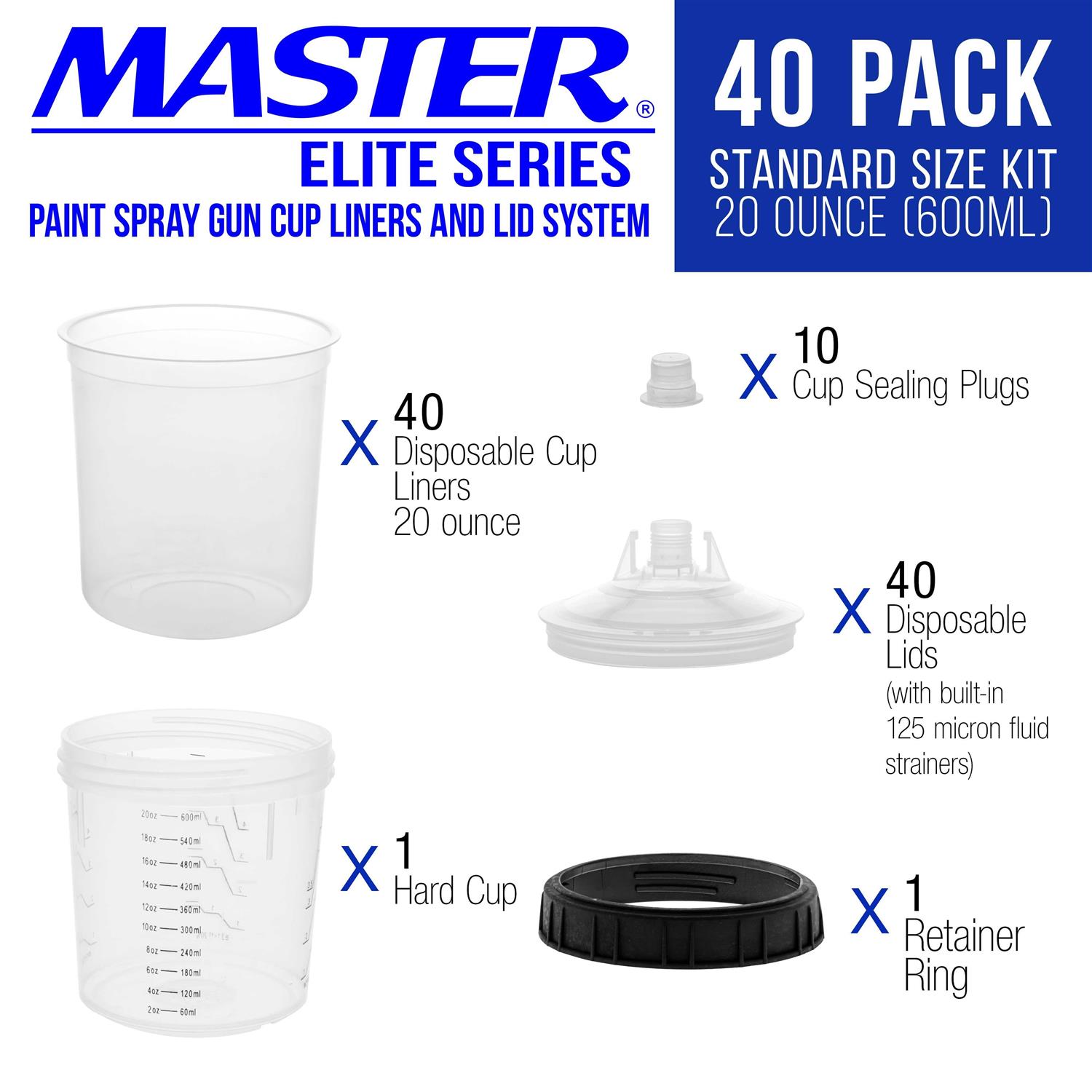 Master Paint System MPS Disposable Paint Spray Gun Cup Liners and Lid System, 40 Pack Standard Size 20 Ounce (600ml) Kit, Clear