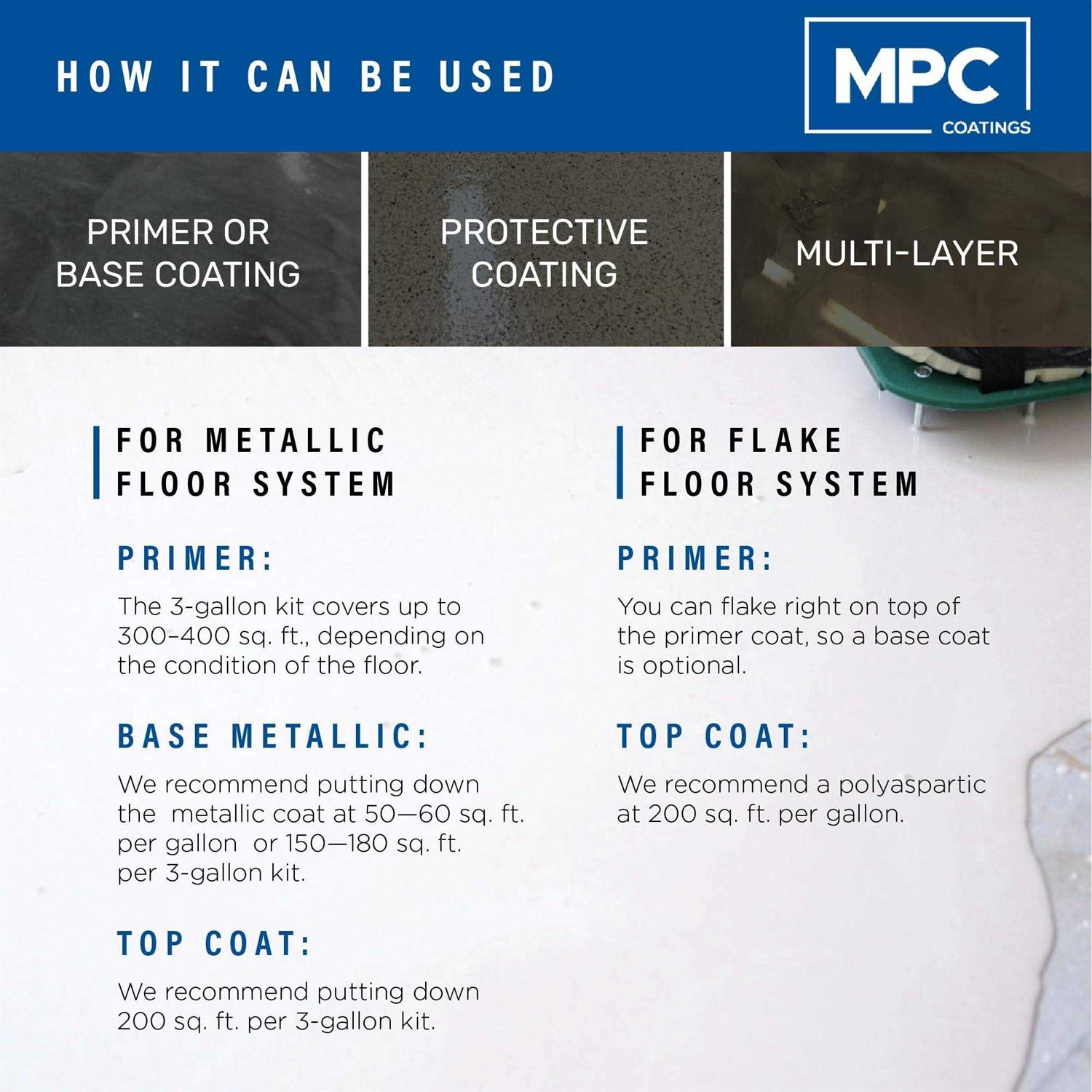 MPC-100 is a 2-component, 100% solids, self-leveling, and high-build epoxy floor coating. It is designed to be used as a protective floor coating on concrete, over an existing epoxy coating, or to create metallic/decorative flooring systems. It can also be used as the binder component for resurfacing or patching surfaces exposed to severe and aggressive industrial environments. MPC-100 is a specifically formulated cycloaliphatic coating that reduces water spotting and amine blushing while providing excellent adhesion, abrasion, impact, and chemical resistance. This coating contains no solvent, is compliant with the CFIA regulations for indirect food contact, and meets the VOC regulations limit of under 100 g/L for architectural floor coatings. Areas of application – Industrial Use – Garages; Warehouses; Airports and hangars; Processing and manufacturing plants to Commercial Use – Shopping malls and boutiques; Hotels; Offices; Showrooms; Restaurants; Hospitals; Schools; Community centers, Bar Tops, Table Tops. Residential Use – Entrances and hallways; basements; entertainment rooms; bathrooms; kitchens and living rooms; outdoors spaces and pool outlines, Table Tops.