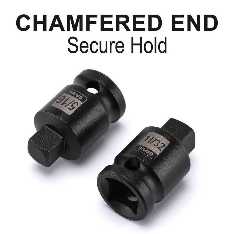 - Tapered male square drive and chamfered female square drive aligns socket to fastener quickly.