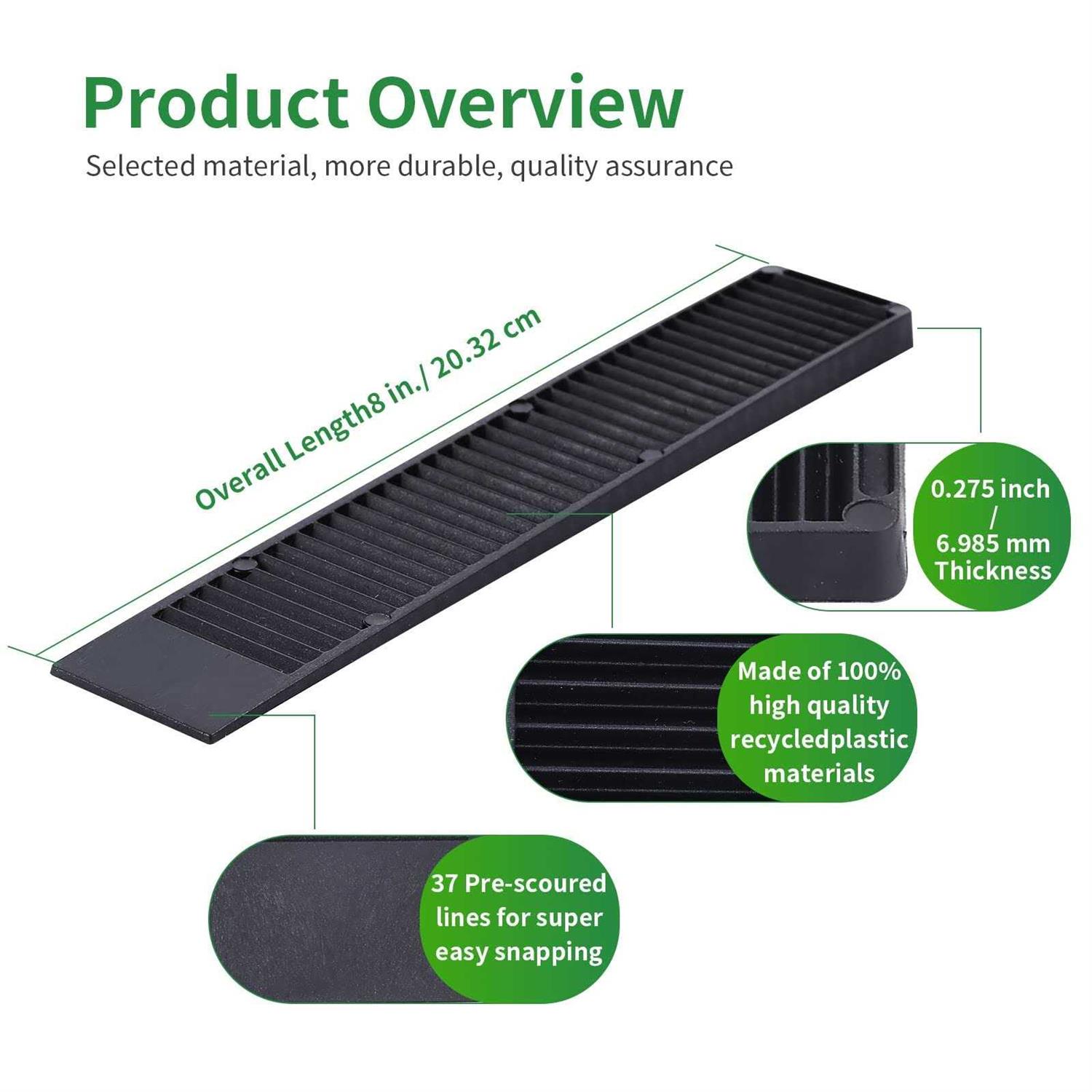 SUPER STRONG AND DURABLE: Plastic wedge shims are stackable and made of 100% high quality recycled plastic materials, Our shims are able to support 30% heavier loads than wood,4 times easier to snap than wood. They also support more weight, allowing you to level heavy appliances, furniture, and more, You can be sure that our shims will last you a lifetime. MULTI-USE WEDGES: The 8-inch composite shims can be used for a wide variety of different projects both indoors and outdoors. Use our heavy duty composite shims for plumbing, appliances, cabinets, countertops, doors, windows, sheds, decks, and mailbox posts. Utilize them as table wedges for restaurants, DIY levelers for furniture, and more! NEVER ROT SHIMS: Our stackable shims are a heavy duty solution to wooden wedges that won’t rot, warp, or crack, holding up to rain, show and other tough or extreme outdoor conditions. The Durable material of these Never Rot shim levelers is Water proof and resistant to decay.With strong heat resistance and low temperature resistance, they are not prone to deform and can maintain better leveling ability SUPER EASY TO CLEANLY BREAK TO SIZE: Shims measure approximately8” Length, 1.5” Width, and 0.28” height. Taper measures 5/16” to 1/16”, Will hold 16,000 pounds of pressure without fail.With 37 Pre-scoured lines snapping is super easy and there is no need for additional cutting or trimming, saving time and energy. No tools required, simply measure and snap.