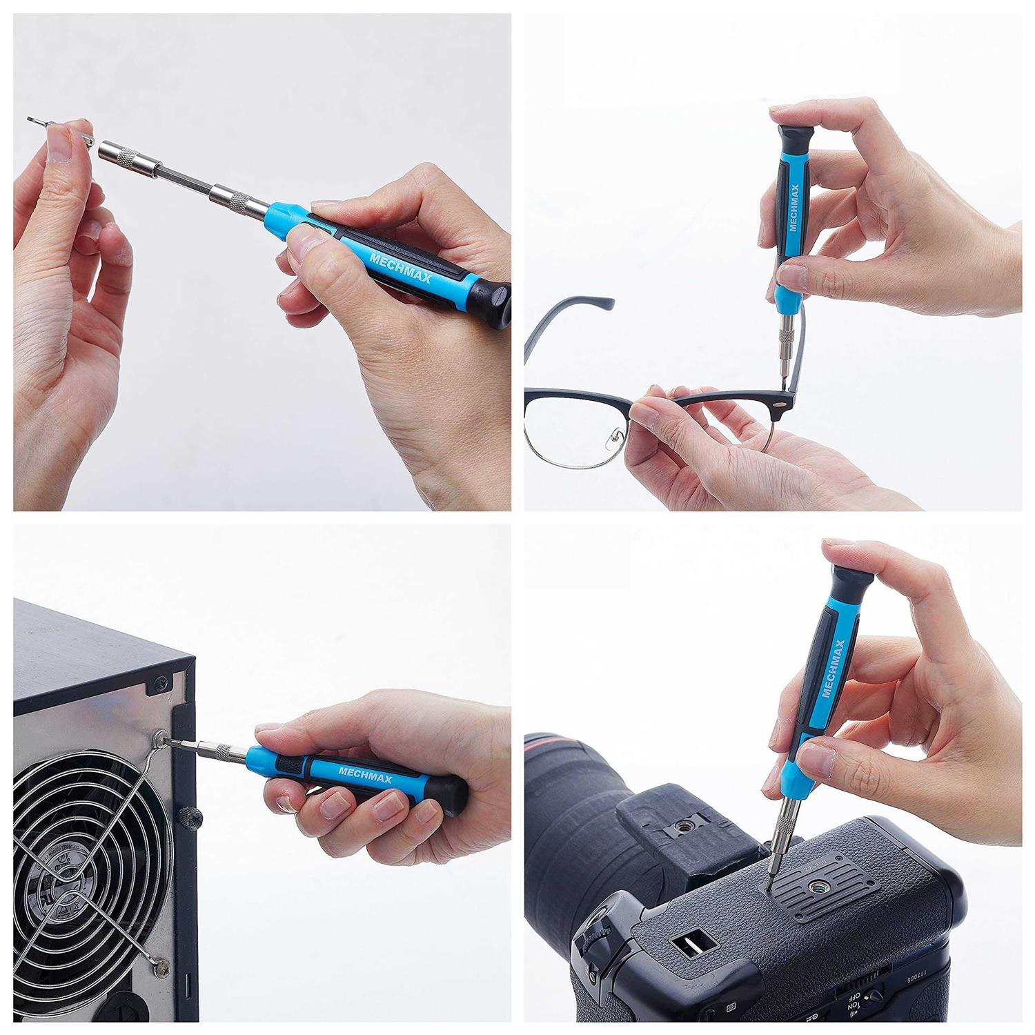 HOME ESSENTIAL- Designed with most popular size sockets, screwdriver bits and precision bits for household, garage, apartment, dorm, back to school, electronics equipment, glasses, jewelry repair projects, and as a gift VARIETY- Contains 9 piece 1/4 inch drive sockets, 55 piece wide range sizes of screwdriver bits and presision screwdriver bits, 1 piece 1/4 inch drive none slip grip ratcheting bit driver, 1 piece precision bit driver and 2 extenion holders HIGH PERFORMANCE- High strength drop forge Chrome Vanadium steel bits and alloy steel sockets, with heat treatment provides hardness and torqueness for high performance DURABILITY- Sockets are made with heat treatment and polished chrome plated finish which protects against corrosion, non-slip PP+TPR soft grip comfort drivers, both provide durable strength for user EASY STORAGE- All tools contained in a sturdy transparent lid injection plastic case for easy tool storage and identification, keeping tools safe in house or garage and good portability The MECHMAX 68 Piece Ratcheting Screwdriver Bits and Socket Set is a great portable tool kit for your home, house, apartment, back to school or as a gift. The set contents a wide range size of screwdriver bits and 9 piece 1/4 inch drive sockets for most home basic projects. The TPR + PP non-slip ratcheting screwdriver handle has forward and reverse ratcheting for quick adjustments, the magnetic extension holder adapt to 1/4-inch drive bits. The precision bits driver for exquisite projec on digital equipment, jewelry, watches and glasses 35- Bits (6.35*25mm) Slotted: 3, 4, 5, 5, 6, 6, 7, 7 mm Phillips: #0, #1, #1, #2, #2, #2, #3, #3 PZ: #0, #1, #2, #3 Star: T10, T15, T15, T20, T20, T25, T27, T30 Hex: 3, 4, 5, 6 mm Square: S0, S1 Socket Adapter 20- Precision Bits(4*28mm) Slotted: 1, 1.5, 2, 2.5 mm Phillips: #000, #00, #00, #0, #0, #1, #1 Star: T4, T5, T6, T7, T8, T9 Hex: 2.0, 2.5, 3.0 mm 9- 1/4 in Drive Sockets: 4, 5, 6, 7, 8, 9, 10, 11, 12 mm 1- Precision Bits Holder 1- Precision Bits Driver 1- Magnetic Bits Holder 1- Ratcheting Bit Driver In Plastic Case