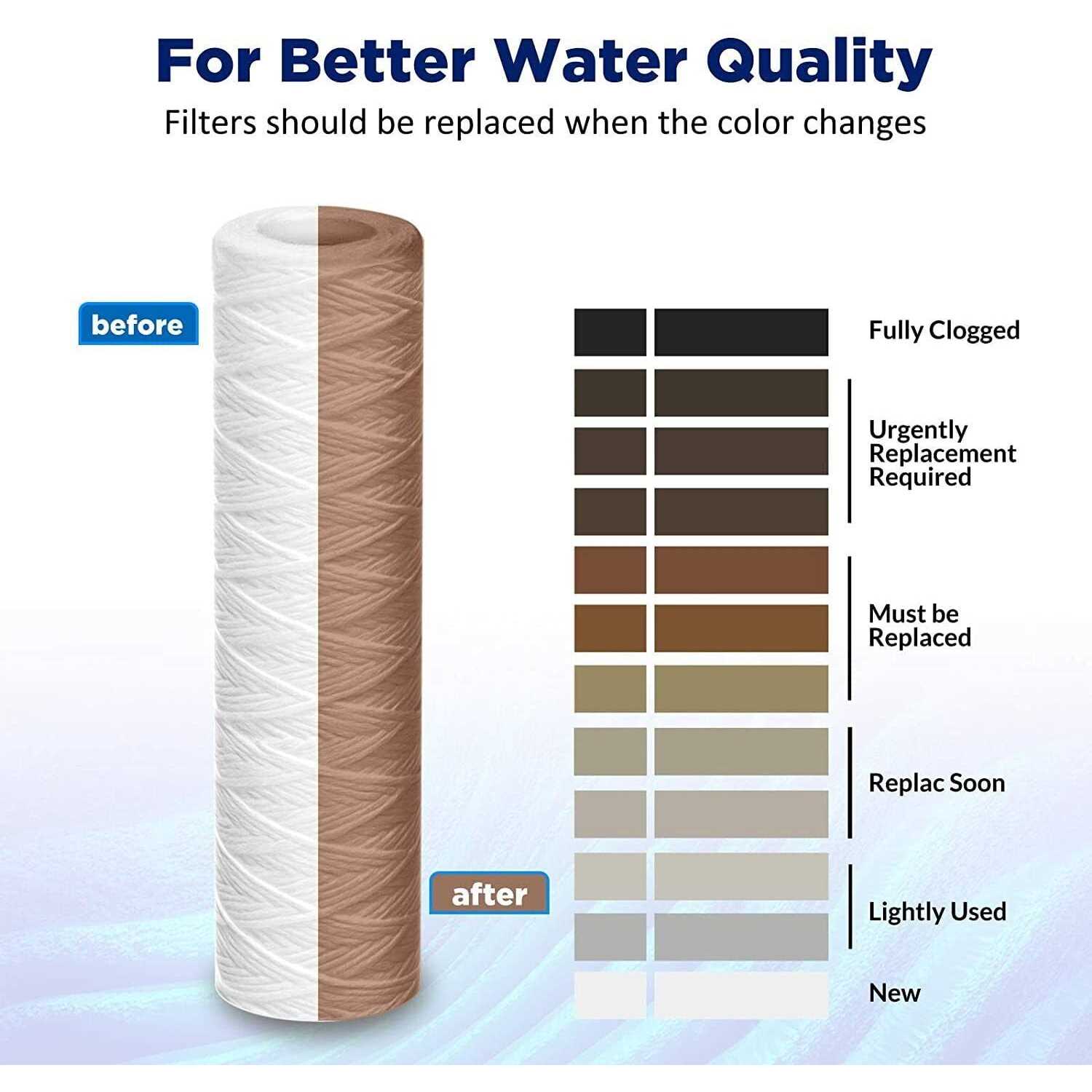 String Wound Water Filter Cartridge Excellent choice to filter sediments from the potable well or tap water. As the first line of defense in the filtration system, it can effectively prevent the clogging of water pipes and prolong the service life of water equipment. Widely used as a prefilter for reverse osmosis (RO), whole house water filtration systems, well water filtration system and various commercial and industrial applications. This String-wound sediment water filter has FOUR times the dirt holding capacity and DOUBLE the flow rate of PP sediment filter, allowing for longer service life, which can last up to 20,000 gallons. The filtered capacity and change-out cycle depend on the inlet water quality. Replace the filter at least every six months to maintain performance. Standard Universal Size Replacement Models: Replacement for the standard 10×2.5-inch filter, like GE FXWSC, FXUSC, Dupont WFPFC4002, WFPFC5002, WFPFC3002, Culligan CW-F, CW-MF, P1, P5, Hy-dronix SWC, SDC, SGC, SPC Series, Aqua-Pure AP110, AO Smith AO-WH-PRE-R2, AO-WH-PRE-RP2, AO-WH-PREV-R2, OMNIFilter RS-12, RS2DS, RS3DS, RS14-SS, RS14-DS, RS1SS, Campbell 1SS, 1SHD, SED-S5, S110-12, 1SL-30, American Plumber W5W, W30W, W5P, W25P, and more. Compatible Housings: Fits most 10-inch filter housings. Compatible with GE GXWH04F, GXWH20S, Dupont WFPF13003B, WFPF38001C, Culligan HF-150A, HF-360A, WH-S200-C, Hy-dronix HF2/HF3/HF4 Series, Aqua-Pure AP11T, AP101T, AO Smith AO-WH-PRE, AO-WH-PREV, OMNIFilter WH5-S-S06, Campbell SF10, VIH, American Plumber WC34-PR, and more. If you need whole house water filter housings,pleaseclick here