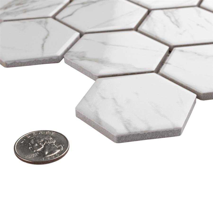 Merola Tile Emulating the timeless beauty of marble in an easy-to-maintain material, this porcelain mosaic floor and wall tile bring functional sophistication into any living space. This marble alternative offers an innovative twist to classic elegance with a modern hexagon mosaic design. Marbleized hexagonal chips are arranged on an interlocking mesh to create a seamless installation. Set on a smooth, glossy white base glaze, each mosaic is complemented with light and dark grey veining striations that sporadically flow throughout each piece for added authenticity. This minimalistic geometric porcelain mosaic is unique yet simplistic enough to integrate into any design, ranging from traditional style renovations to modern home projects. Its impervious and frost-resistant features make this an ideal tile for both indoor and outdoor residential use, including backsplashes, bathrooms, showers, and kitchens. Tile is the better choice for your space. This tile is made from natural ingredients, making it a healthy choice as it is free from allergens, VOCs, formaldehyde, and PVC.
