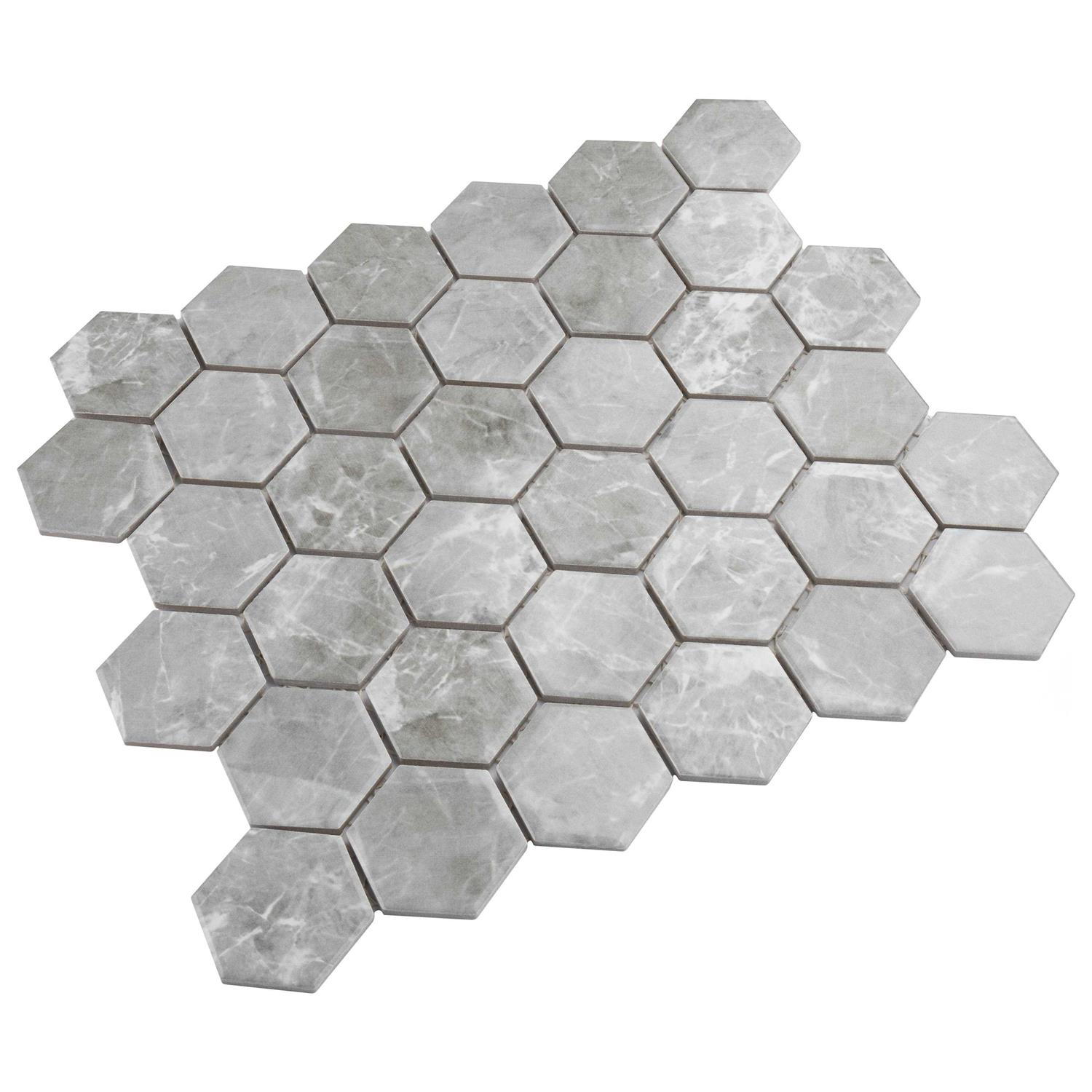 Merola Tile This marble alternative offers an innovative twist to classic elegance with a modern hexagon mosaic design. Marbleized hexagonal chips are arranged on an interlocking mesh to create a seamless installation. This minimalistic geometric porcelain mosaic is unique yet simplistic enough to integrate into any design, ranging from traditional-style renovations to modern home projects. An ideal tile for both indoor and outdoor commercial and residential use, including backsplashes, kitchens, bathrooms, showers, entryways, and patios. Tile is the better choice for your space.