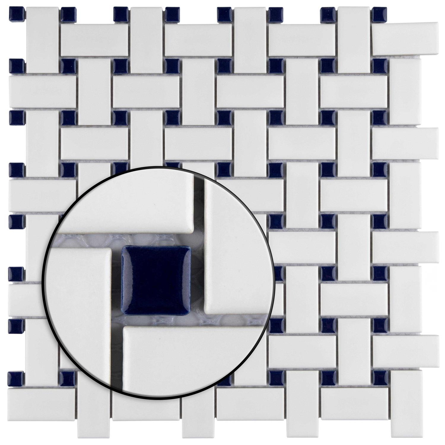 Metro 1.32″ x 2″ Porcelain Basketweave Mosaic Wall & Floor Tile Merola Tile White/Cobalt Blue