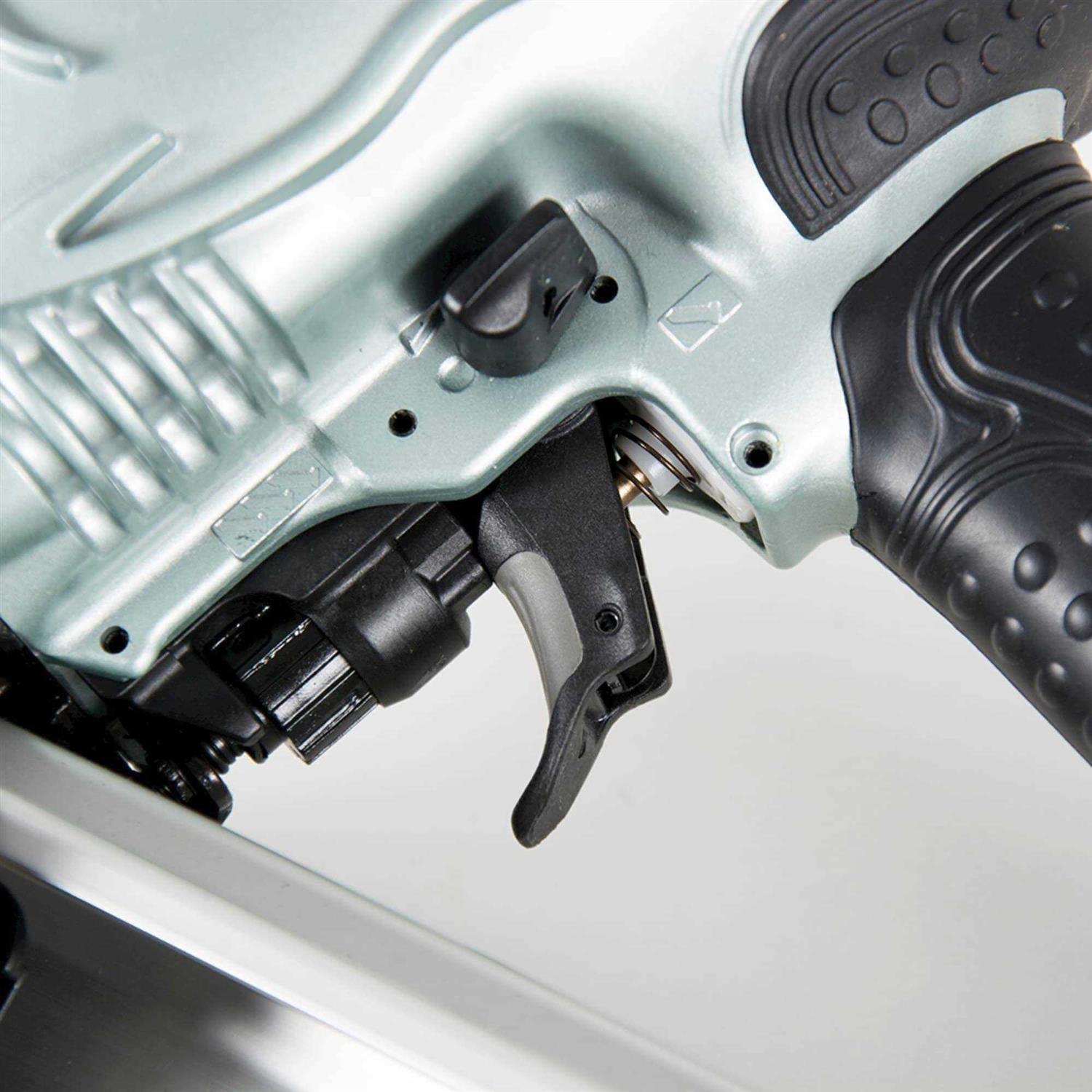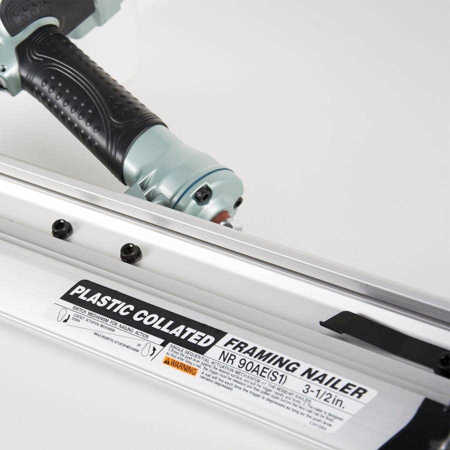 The NR90AES1M framing nailer drives plastic collated nails from 2 inch to 3-1/2 inch in length and features Hitachi’s next generation “Industrial Design”. The newly redesigned head guard allows for a faster and easier disassembly process, saving you valuable time during tool maintenance. The NR90AES1M weighs only 7.5 pounds, making it easy to use all day, while still providing the of bulkier, heavier nailers. A selective actuation switch adds the convenience of being able to quickly change between bump or sequential fire and the tool-less depth of drive eliminates the need to adjust the pressure at the compressor. The simple two-step loading makes fastener replenishment quick and easy, reducing downtime. Includes Safety Glasses (875769).