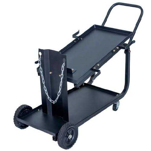 The Metal Man Universal Welding cart with handle is designed to make maneuvering your welder easy. The single cylinder rack is capable of holding up to a 7-1/2 in. Dia, 80 cu. ft. cylinder and comes with a securement chain to hold the cylinder in place. The extended slanted top shelf accommodates most brands of welding equipment and places the welder controls at an easy to use angle.
