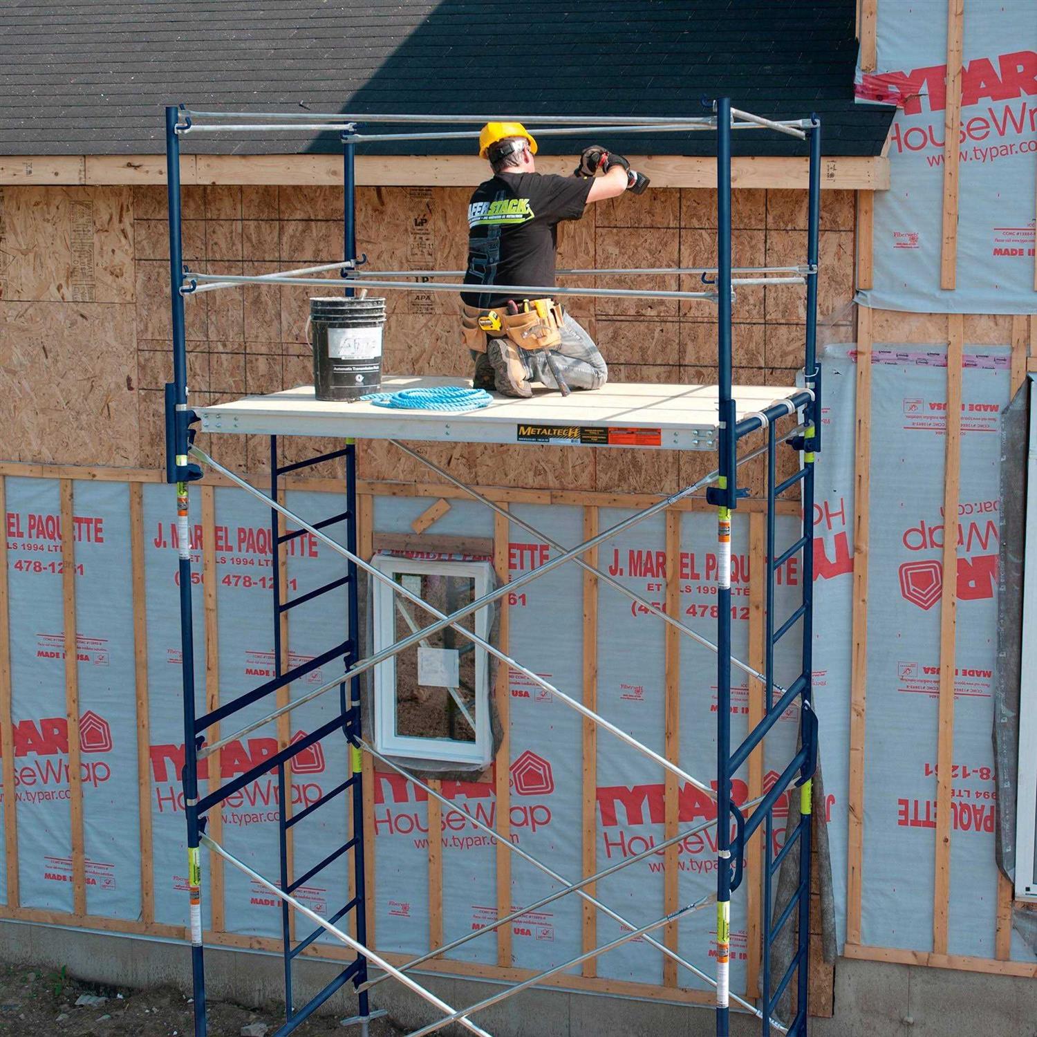 Metaltech Exterior scaffolding frames are designed for safety when working on home improvement or commercial projects. The coupling pins fasten securely with spring locks on the frame. The frame rungs are 16 GA steel tubes and the perimeter tubes are 13 GA steel. The frame design can support up to 4,900 lbs. and can stand up to tough job site conditions. Its blue powder textured finish is weather-resistant and makes for fewer work hazards. Our Saferstack innovation allows interlocking stacked frames to take up 30% less space and prevents them from sliding. Combined with crossbracing, and other safety components, the frames are suitable for securely holding platforms to form scaffolding sections that can be installed on casters or on levelling jacks. These scaffolding sections are ideal for painting, masonry, facade work, and more.