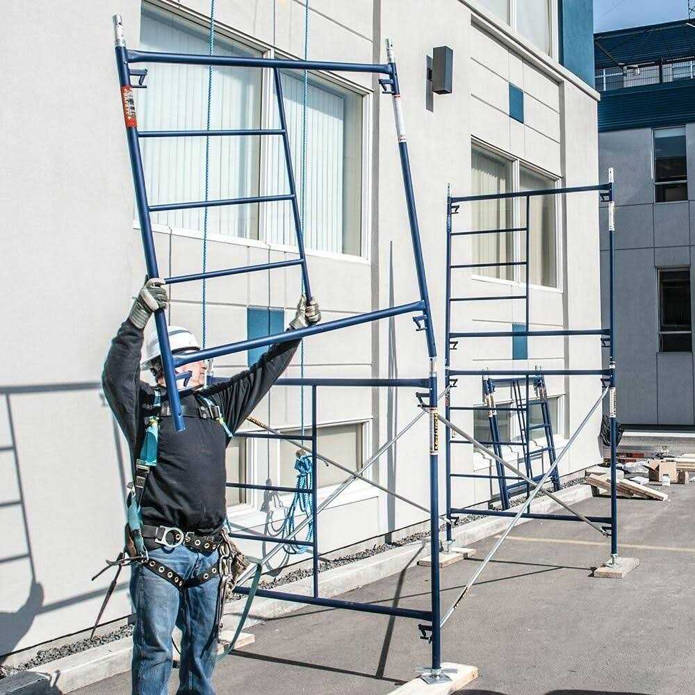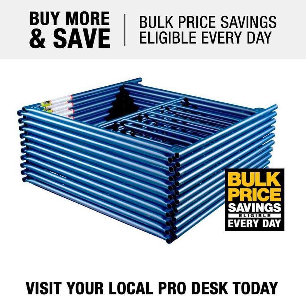 This Metaltech Single Lift Scaffold Set provides everything needed to frame a scaffold, including two 60in. x 60in. Blue powder-coated anti-slip steel scaffold frames each with coupling pin and springs, and two 7ft. x 4ft. galvanized steel cross braces. These products meet all OSHA, ANSI and CSA requirements. Metaltech’s exterior scaffolding systems and accessories are built to make your work easier and safer. Safety is the key when working with heights. With Metaltech’s quality control, testing procedures and precision welded frames, you can be assured of a safe reliable product. The patented Saferstack design brings safety to another level. Each frame nests into one another when stacked for storage or transport. This feature allows you to transport or store the frames using up to 30 less space, and it also reduces the probability of the frames sliding, reducing the risk of worker injury. Metaltech has been in the business of building scaffolding right since 1962. , Finish Type Textured anti-slip powder-coat, Material Type Steel, Dimensions W x D x H in. 84 x 60 x 60, Color Blue, Post in. Exterior 1 5/8in. O.D. Interior 1in. O.D., Capacity lbs. 4,675 per frame 9,350 per set, Hardware Type Frame. Blue anti-slip powder-coated textured finish Meets or exceeds OSHA, ANSI and CSA standards Saferstack Frames each include coupling pin and spring and are designed to interlock for safer storage and transport Saferstack uses 30 less storage space than regular frames Saferstack reduces the chance of load shifting, reducing chance of worker injury Made from high quality steel with precision welds designed to last Perimeter Tubes 1 5/8in. O.D. made of 13-gauge steel Interior Tubes 1in O.D. made of 16-gauge steel All galvanized pins and locks included with each frame Capacity is tested at 41 safety factor and could change depending on frame style and height. Cross braces must be installed on each side of scaffold for it to reach its full capacity and be level. Model Number: M-MFS606084AN1. Age Group: adult.