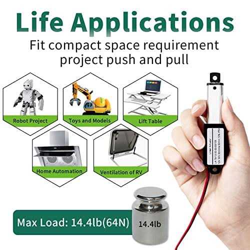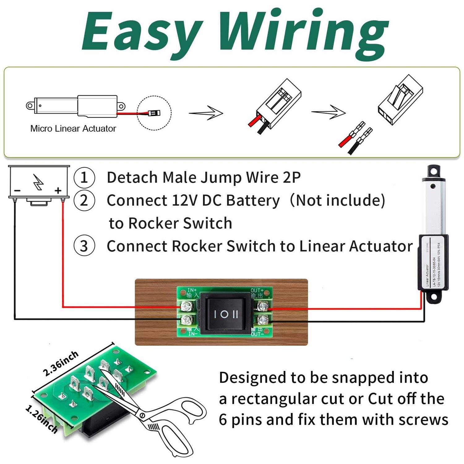 Linear Actuator With Rocker Switch Kit – 64N Small electric actuator powered by 12 volts DC are mini actuator which create motion in a straight line, suitable for small and medium-sized loads, with mounting brackets, rocker switches, you can easy mounting it and manually control the extend and retract of the push. Hold On Position You Want – Reverse polarity rocker push switch with ON/Off/ON 3 operation press button, it will in locked state, compare with momentary switch, do not need you hold the switch button all the time. Press “Off” button you can turn off power to the motor and stop position as you wish, More flexible and secure when you close window or pigeon cage. Strong and Durable Linear Actuator – Built-in high quality aluminum gear and over-voltage protect, well constructed for long-term use. It come with end limit switch that will automatically stop when the device reaches the end of stroke, Ensure the motor won’t burn out Multi-Applications – 2″” Stroke small linear actuators fit tight space requirement project, a great pushers used in applications such as agricultural machines and equipment, medical devices, home automation, cabinet door, robot’s gripper, deck chair, window opener, linear servo, solar tracker, extend and retract the cylinder Easy to Mounting – Package come with 2pcs mounting bracket and rocker switch with copper clad laminate, make you convenient to installation. Just wire up the red wire to positive and black wire to negative, Press on switch to control your actuator, work like a charm!”