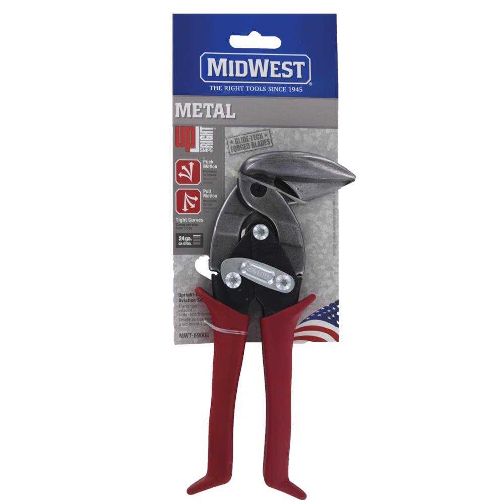 Midwest’s range of upright aviation snips makes cutting easier in tight spaces and overhead positions. The unique push or pull cutting motion with a 90 degree blade design is revolutionary. These snips can turn or rotate in hand when cutting circles. Creating ergonomic hand posture improving wrist range motion. These snips are of tradesman and industrial quality and have the capacity of cutting 18 gauge cold-rolled sheet metal and 22 gauge stainless steel metal.
