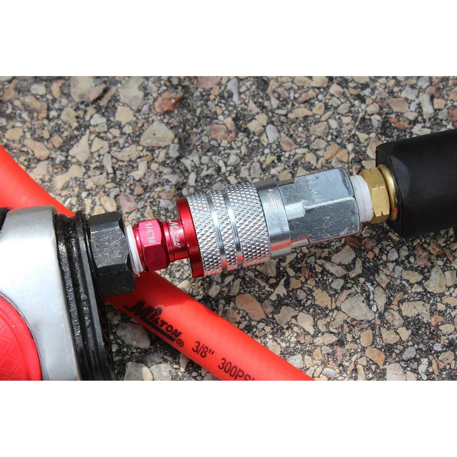MILTON 14 Piece M style ColorFit set customized a color code system that allows for easy matching of couplers and plugs among the standard Industrial pneumatic air coupler quick connects. Great way to solve that annoying problem of potential crossing contaminating different air lines. By dedicating certain colors to different air lines, this will eliminate the risk of mixing a lubricated line with a dry air line which will help prolong your applications and quickly finishing any project. Each piece coated with Anodized Red aluminum and heavy duty steel sleeves to prevent scratches or dulling of the coupler and plug after uses.