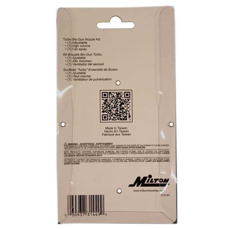 Turbo blow gun nozzle kit – 3 piece turbo blow gun nozzle kit – 3 piece features and benefits: 1/4in male national pipe thread made for use with milton blow guns s-181 and s-182 one adjustable, one high volume and one fan spray three piece turbo blow gun nozzle kit is perfect for adding versatility to milton turbon style blow guns. Simply thread nozzle onto the end of the s-181 or s-182 turbo blow gun.