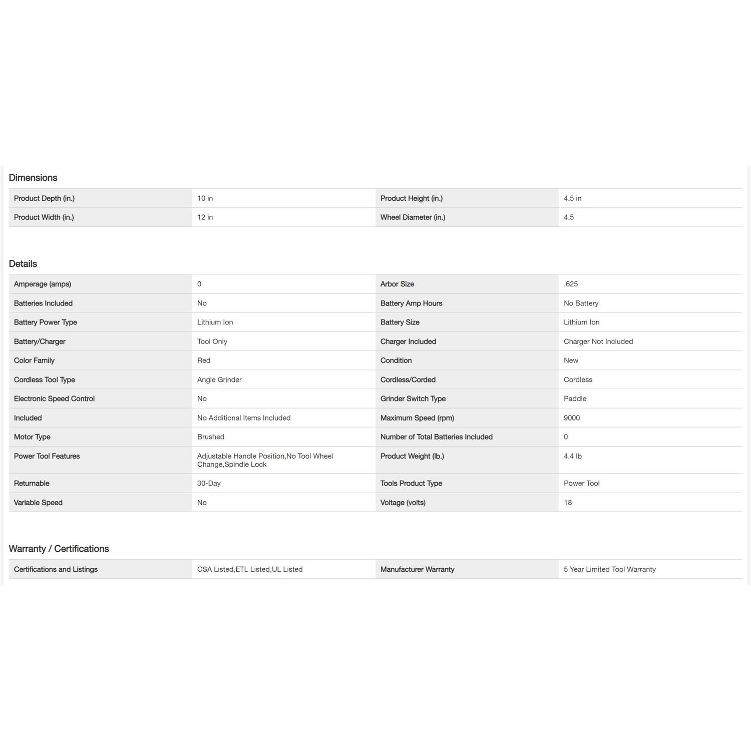 The M18 4-1/2″ Cut-off/Grinder provides you with the speed, durability, and ease-of-use to handle industrial applications. The cut-off grinder has a 4-pole motor, giving you maximum power when cutting or grinding. The tool is the only cordless cut-off/grinder in the market to feature the user-preferred paddle switch, providing you with comfort and ease-of-use when operating in various positions. L-shape intake vents protect the grinder cut-off tool by keeping harmful debris from entering the tool and damaging internal components. The tool is powered by our M18 REDLITHIUM battery packs (sold separately), giving you 35% faster cutting speed and up to 50% more cuts on a single charge.