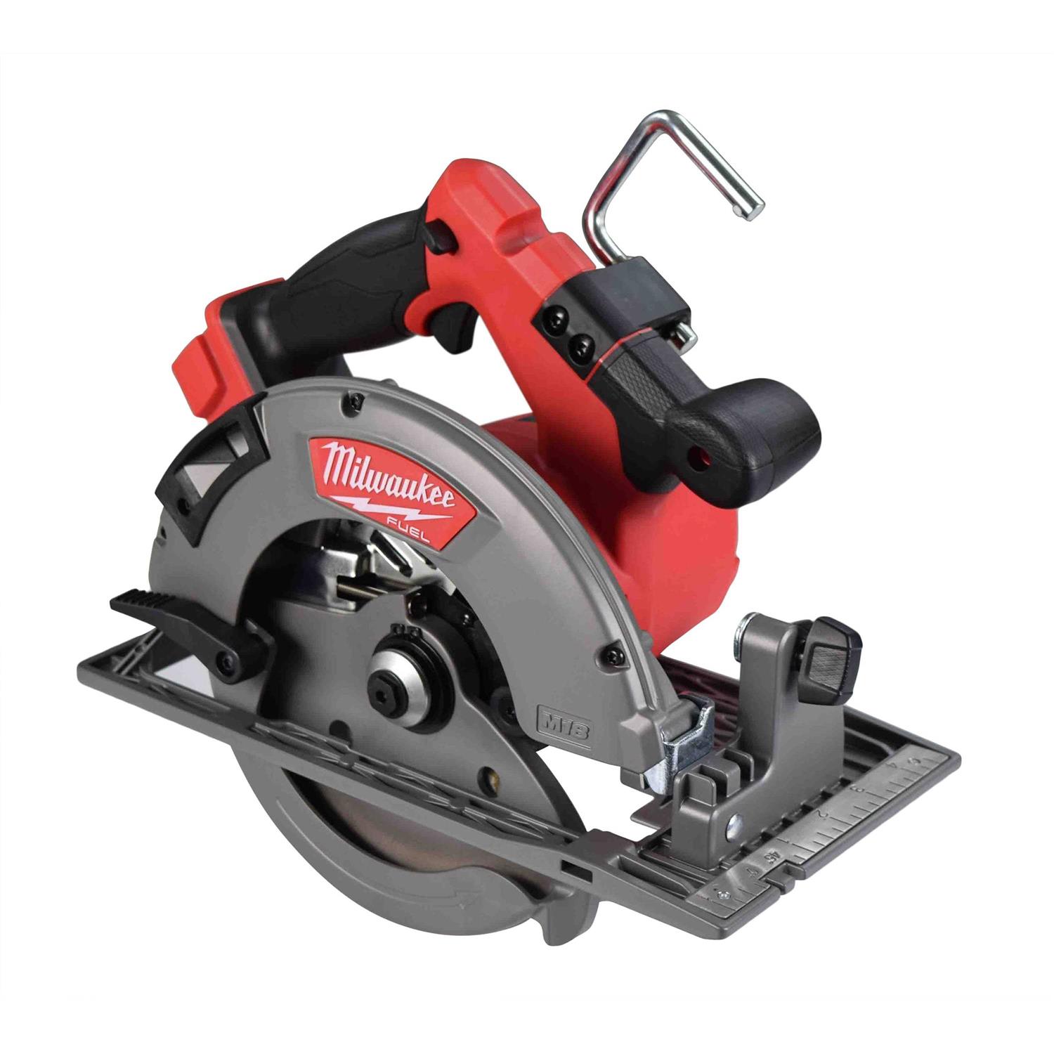 Designed for the carpenter, remodeler and general contractor the M18 FUEL 7-1/4 in. Circular Saw from Milwaukee generates the power of a 15A corded saw, cuts faster than a 15A corded saw and gives users up to 750 cuts per charge. The POWERSTATE Brushless Motor provides 5,800 RPM and higher speeds under load for corded cutting performance. REDLINK PLUS intelligence ensures maximum performance and protection from overload, overheating and over-discharge. The M18 REDLITHIUM High Output HD12.0 battery delivers unmatch run-time in all applications. All magnesium guards and shoe delivers extreme durability for job site conditions. A built-in rafter hook offers quick and easy storage and an electric brake stops the blade quickly after cuts are complete for maximum productivity.