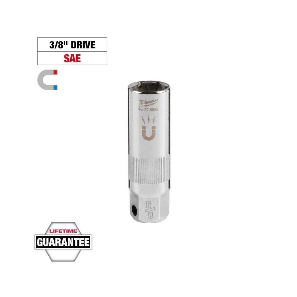 The MILWAUKEE 3/8″ Drive 5/8″ 6-Point Magnetic Spark Plug Socket features an amplified rare earth magnetic retainer that balances a secure fit with smooth removal of the spark plug from the socket. A precision knurling on the outside of the socket allows for better control when hand tightening or loosening. Both the socket and retainer withstand harsh chemicals commonly found in the garage. Stamped size markings make it easy to identify the size of the socket. The external hex at the base of the socket fits an 11/16” wrench for added control. Milwaukee Spark Plug Sockets are backed with a Lifetime Guarantee.