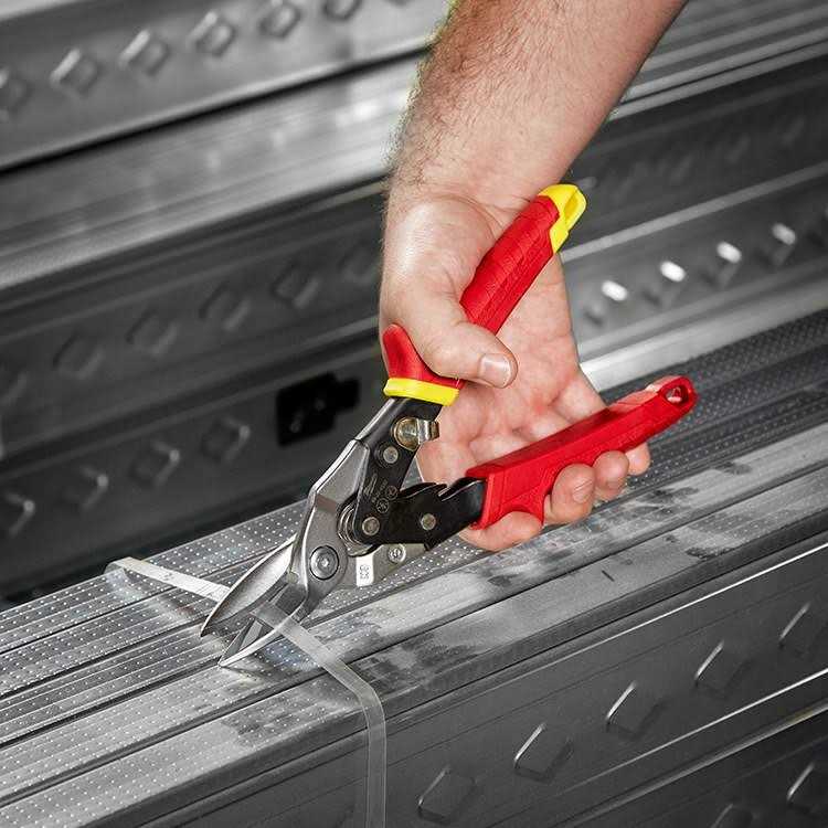 The Milwaukee hand tools metal aviation snips are made from forged alloy steel that is chrome plated for increased lifetime, perfect for short straight cuts. Serrated cutting edges preventing any slippage when cutting. Compound leverage action, the torsion spring opens jaws automatically during cutting for faster cutting action and less fatigue work. The handles feature ergonomic and durable over moulded grips with thumb and forefinger slots for increased comfort and less fatigue. These allow the user to push through sheet metal with ease with less risk of cutting oneself. Flush slim line design with a one-hand locking mechanism. Featuring a triple cutting direction identification, on the head, handle and by colour coded handle with a maximum cutting capacity aluminium 1mm, stainless steel 0.6mm and steel 1mm.