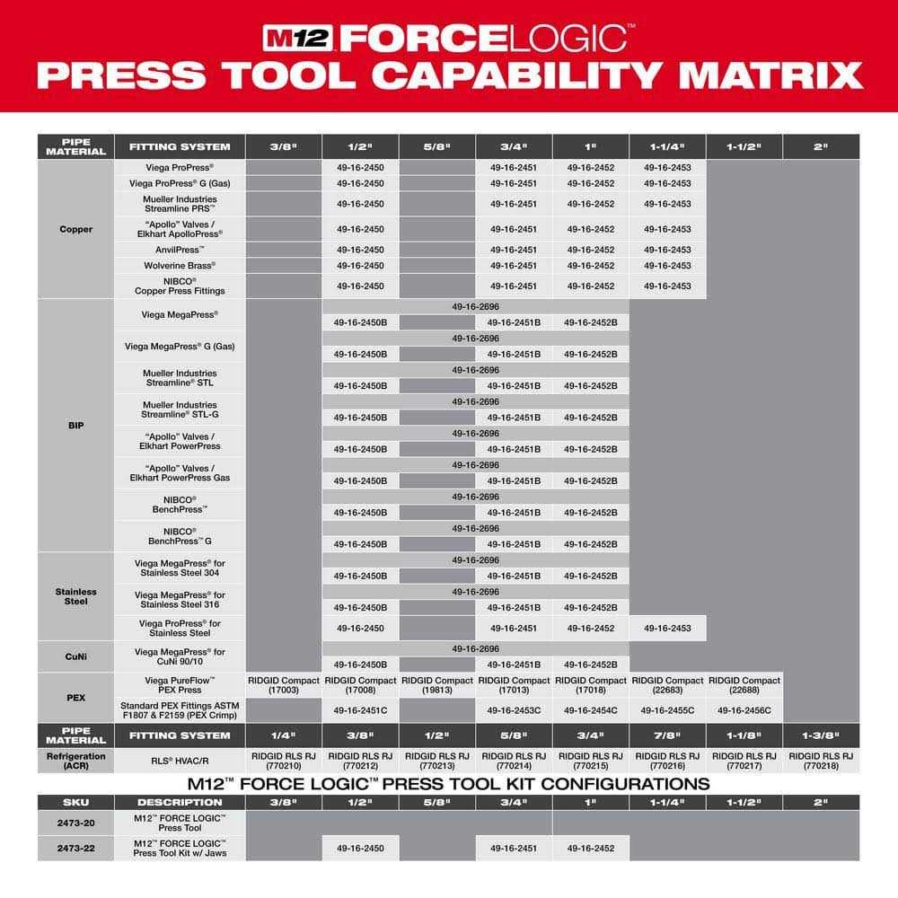 The PEX Crimp Jaws for the M12 Force Logic Press Tool provide an easy to use solution for PEX crimp installations, eliminating the repetitive strain required with hand tools. With an easy open, inline design, the jaws are optimized for one handed pressing with the M12 Force Logic Press Tool. These PEX crimp jaws offer the highest confidence for quality connections, as the spring-loaded opening grips the ring for precise alignment to the fitting, and a green light on the press tool indicates a completed crimp. Compatible with F1807 & F2159 connections.