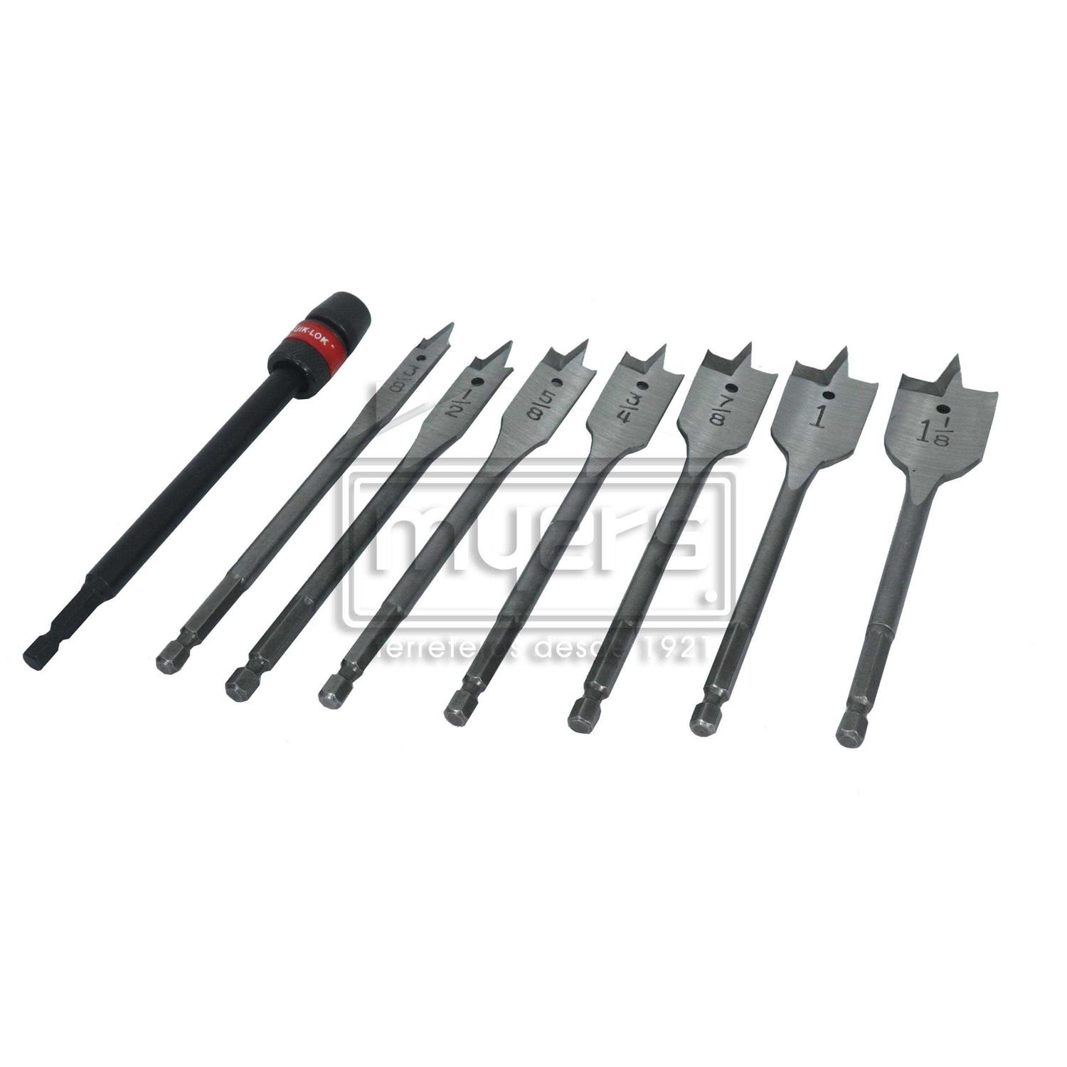 The Milwaukee flat boring bit set is designed to use for drilling clean holes at any angle in a variety of surfaces. Double wing spurs offer smooth hole formation while minimizing vibration and preventing breaking out. Cutting edge technology initiates quick wood boring and better chip removal thus allowing heat from dissipating. Quick-lok mechanism enables quick and easy accessory changes in confined spaces.The 1/4 Inch quick-change hex shank conforms well with all Quik-Lok extension. Set contains 3/8 Inch, 1/2 Inch, 5/8 Inch, 3/4 Inch, 7/8 Inch and 1-1/2 Inch bits.