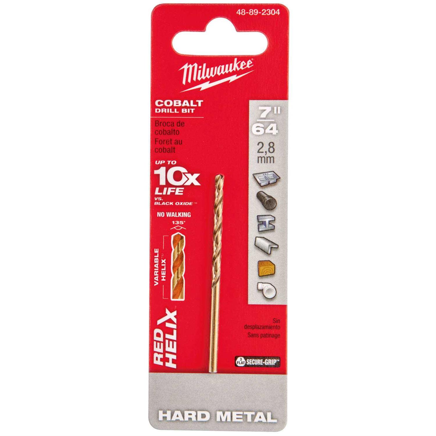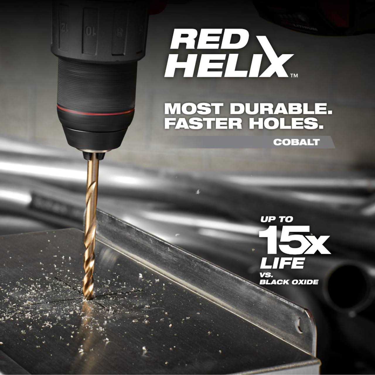 Milwaukee COBALT RED HELIX drill bits are engineered for extreme durability and long life in hard metal applications. Designed with a variable helix that includes an aggressive 35° helix angle which ends at 15°, the cobalt bits with RED HELIX provide Rapid Chip Removal limiting heat buildup to Stay Sharper Longer. The 135° split point tip delivers a precision start and prevents walking for fast, accurate holes. Ideal for tough applications and provide up to 10X life vs. Black Oxide Drill Bits but can be used in all twist drilling applications.