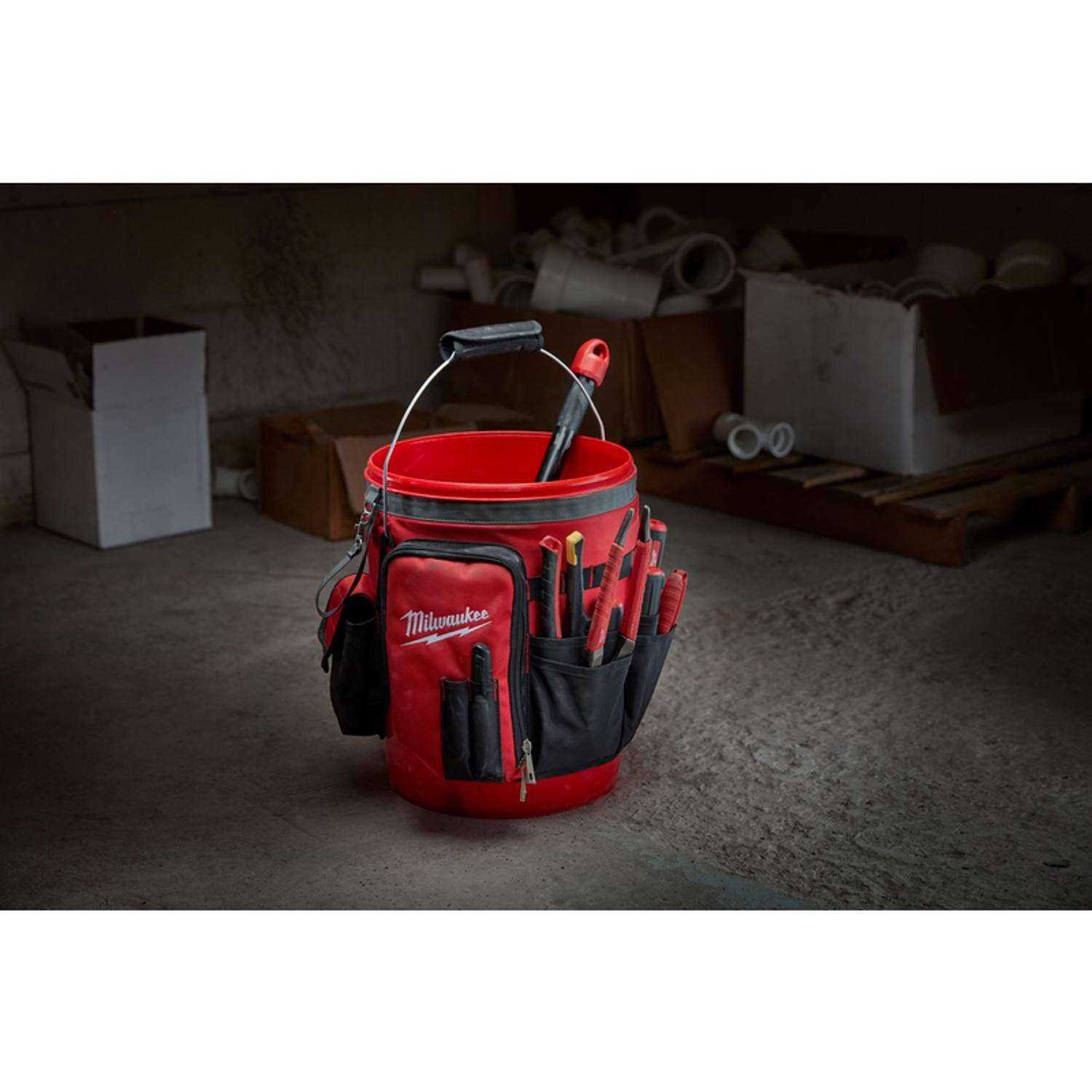 DescriptionBucket Organizer BagThe Bucket Organizer Bag by Milwaukee? gives you complete, organized access to the space of a 5-gallon bucket interior with its open design. This durable bags 1680D ballistic materials provide a versatile workstation for a wide variety of needs. The Milwaukee bucket organizer bag has two large exterior zipper pockets and 30 smaller, open pockets, so you can carry and organize many tools, parts and smaller job materials. This innovative Milwaukee storage solution is ideal for plumbers or other professionals who need to organize and use small tools regularly. This wrap-style organizer bag is compatible with and fits over a standard 5-gallon bucket.