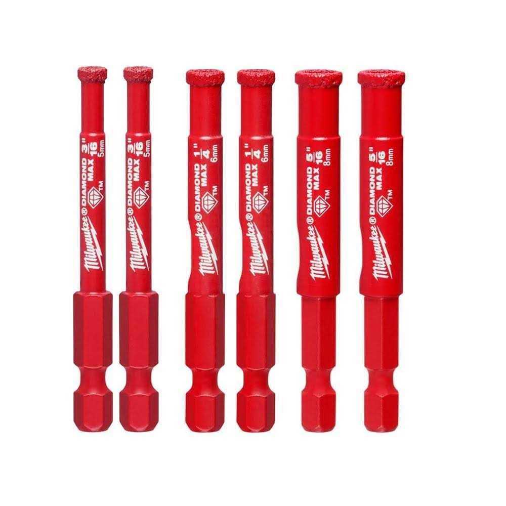 This set includes two 3/16 in., two 1/4 in., and two 5/16 in. diamond hole saws. Diamond MAX Hole Saws deliver best-in-class performance, with higher grade diamonds for maximum heat and fracture resistance. An improved continuous brazed edge provides clean, superior joint strength, and better diamond retention when cutting hard, abrasive materials. These diamond hole saws are designed as a single cutting solution for users cutting tile, stone, and glass. Diamond MAX offers the lowest cost-per-hole on the market.