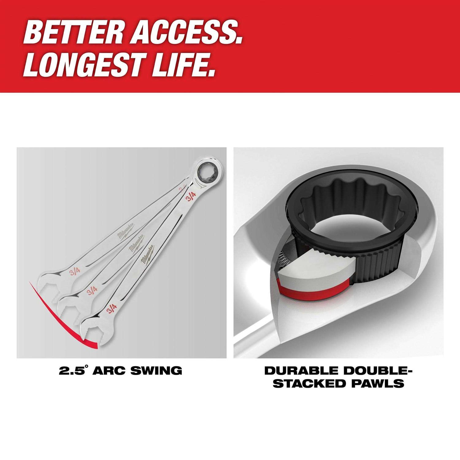 Milwaukee’s ratcheting combination wrenches offer an industry-leading 2.5° of arc swing, allowing our users to work quickly and efficiently even in the tightest of spaces. Our durable double-stacked pawls in the ratcheting mechanism offer longest ratchet life and best access with 144 ratcheting positions. The MAX BITE open-end grip improves the wrench’s grip on nuts and bolts, offering 25% more torque than smooth-faced wrenches. The comfortable I-Beam handle design allows superior user comfort. Milwaukee wrenches feature ink-filled size labels for easy size identification, as well as quick distinction between SAE and metric sets. The 15 pc. sets come in trays designed for steel storage drawers, allowing for efficient storage with no wasted space. The 7 pc. kits come in a portable, locking storage tray, offering organization both on and off the jobsite.