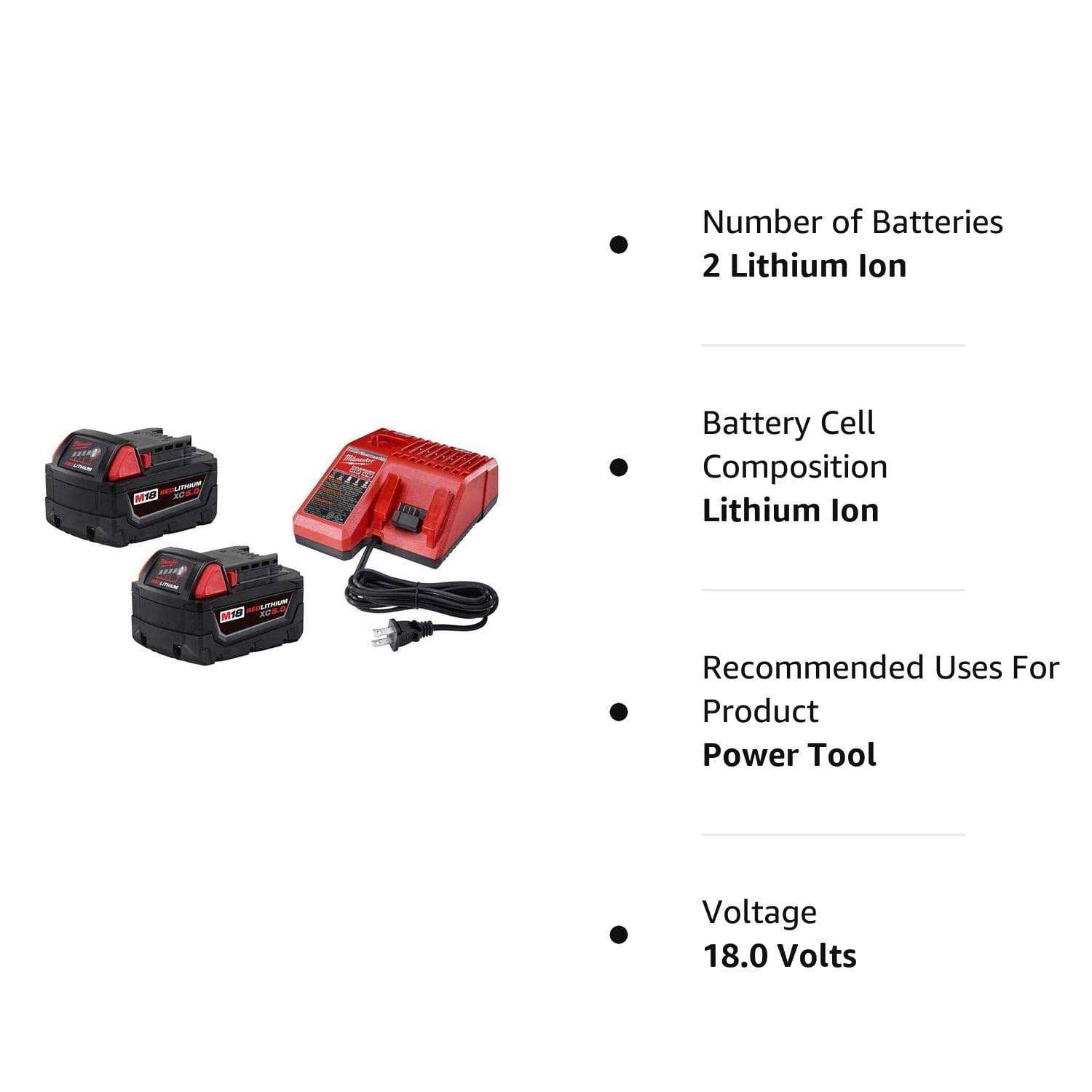 The M18 Redlithium XC5.0 Starter Kit delivers up to 2.5X more runtime 20% more power and 2X more recharges than standard lithium-ion batteries. The lithium-ion battery pack features superior pack construction electronics and performance giving you more work per charge and more work over pack life than any battery on the market. The rechargeable battery also offers you 5.0 amp-hours of runtime. Each battery pack is durably built for heavy-duty use runs cooler and performs in climates below 0F/-18C. This protection routes water away from the electronics and out of the battery pack extends your battery’s run-time and life by minimizing heat and prevents pack failures from vibration or drops. Built-in REDLINK Intelligence protects the battery from overloads preventing you from damaging your cordless power tools in heavy-duty situations while the discharge protection prevents cell damage. An integrated temperature management system and individual cell monitoring help to maximize your battery’s life. Switch to Redlithium XC5.0 Battery Pack to instantly upgrade the runtime and durability of your Milwaukee M18 cordless tools.