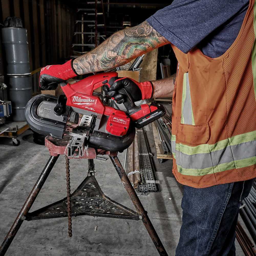 The M18 FUEL Compact Dual-Trigger Band Saw incorporates a Dual-Trigger Design for Safe Cutting which requires triggers located on both the back and front handle to be engaged in order to operate. The MILWAUKEE M18 FUEL Compact Band Saw offers a light-weight, balanced design with the largest cutting capacity of any compact band saw at 3-1/4 in. X 3-1/4 in. The M18 FUEL Compact Band Saw utilizes a POWERSTATE Brushless motor and Constant Power Technology for the fastest cutting band saw in its class. The portable band saw is equipped with Jobsite Armor Technology, the tool is better protected from drops and debris with a proprietary composite material and crush zone barriers to absorb impacts. The MILWAUKEE cordless band saw has REDLINK PLUS Intelligence for the most advanced system of cordless power tool electronics, delivering optimized performance and overload protection using total system communication between tool, battery, and charger. A variable speed trigger, tool-free locking adjustable shoe, and LED work light to offers you maximum control and productivity. An integrated rafter hook for hanging makes for easy storage in-between cuts. The M18 FUEL Compact Band Saw accessories include a pipe reamer attachment, providing you with the ability to easily attach the customized reamer attachment (49-90-2029, sold separately) to the back of the band saw to cut and ream with the same tool. In addition to the compact power tool, this band saw includes one set of blade covers and one 8/10 TPI Extreme metal cutting band saw blade.?