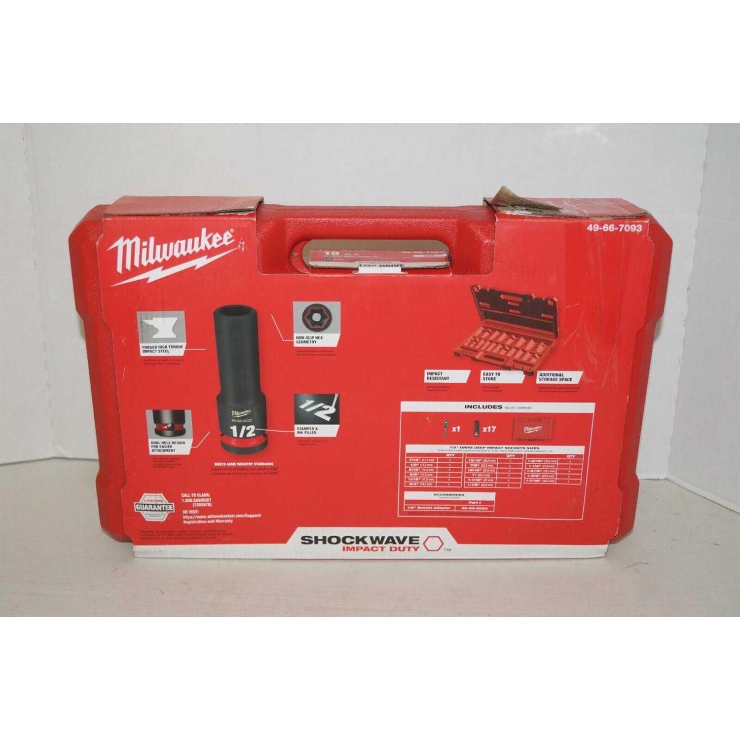 The Milwaukee SHOCKWAVE Impact Duty Socket Set features the boldest, longest lasting markings and extreme impact durability in high torque applications. The stamped and ink filled size marking enables users to select the right socket every time throughout the life of the socket. Engineered with high strength forged steel for optimized performance in heavy-duty applications. The non-slip hex geometry prevents fastener rounding. The dual hole design and ring groove allows for easy socket attachment and removal. This set is optimized to get every job done. The cases are impact resistant and nest together for easy stacking and storage. All Milwaukee SHOCKWAVE Impact Duty Sockets and Extensions are backed by Milwaukee Tool’s Lifetime Guarantee and meet ASME industry standards. For 1/2 in drive impact wrenches, drivers, ratchets, and adapters Stamped and ink filled diameter markings for wear resistance 6-Point design made with forged impact steel for durability Optomized for use with 1/2 in. drive impact wrenches, drivers, ratchets, and adapters Stamped and ink filled diameter markings for wear resistance 6-point design made with forged impact steel for durability in high torque applications backed by our lifetime guarantee Impact resistant case with nestability for easy stacking and storage Dual hole design and groove for easier attachment Non-slip hex geometry to prevent socket and fastener rounding Lifetime guarantee covers impact sockets and extensions only Laser etched part number Meets ASME industry standards Includes: 17 deep SAE sockets in the following sizes: 7/16, 1/2, 9/16, 5/8, 11/16, 3/4, 13/16, 7/8, 15/16, 1, 1-1/16, 1-1/8, 1-3/16, 1-1/4, 1-5/16, 1-3/8, 1-7/16, and (1) 1/4 in. hex to 1/2 in. square socket adapter Tackle the fasteners on all your home projects with the selection of this Milwaukee SHOCKWAVE Drive SAE Deep Well Impact Socket Set lasting durability. Optomized for use with 1/2 in. drive impact wrenches, drivers, ratchets, and adapters Stamped and ink filled diameter markings for wear resistance Impact resistant case with nestability for easy stacking and storage Dual hole design and groove for easier attachment Non-slip hex geometry to prevent socket and fastener rounding Laser etched part number Meets ASME industry standards