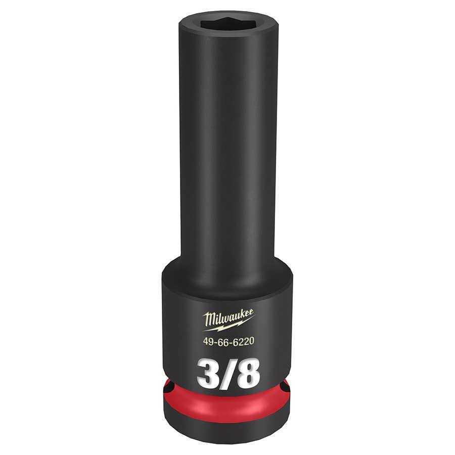 Milwaukee SHOCKWAVE Impact Duty 1/2″ Drive 1-1/2″ Deep 6 Point Socket offers extreme impact durability in high torque applications and features long-lasting stamped size markings for quick and easy socket identification. This socket is constructed of high-strength forged steel and features a non-slip hex geometry that prevents fastener rounding. For added convenience, the socket’s dual-hole design and ring groove makes socket attachment and removal easier. This socket is optimized for use with 3/8-inch drive impact wrenches, drivers, ratchets and adapters.
