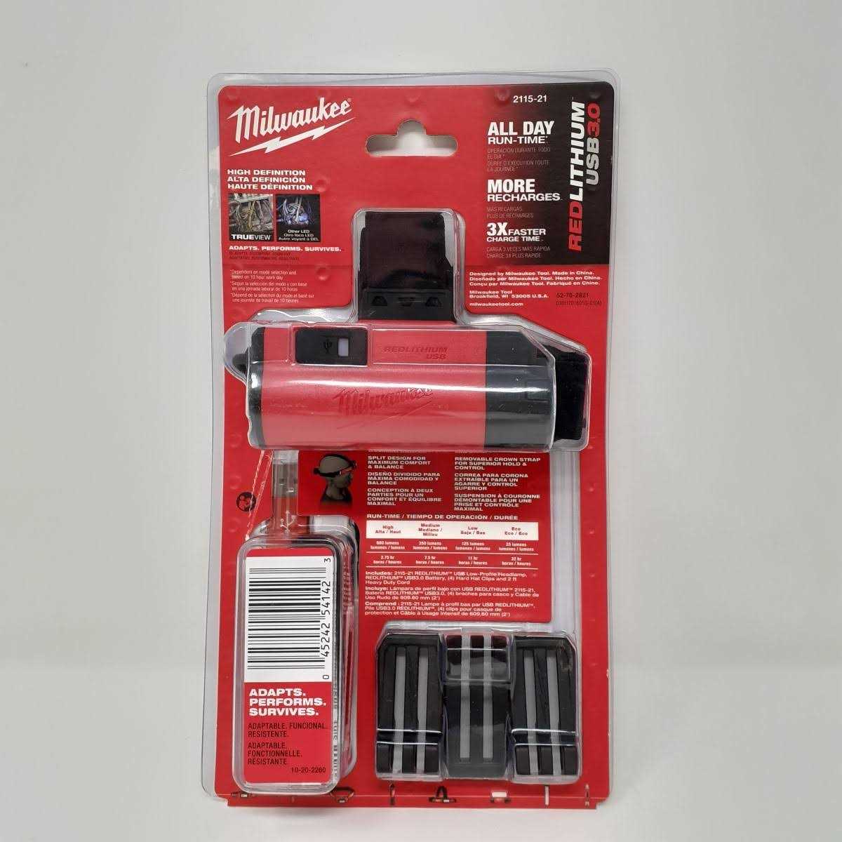 Thin, 1 in. Light head with wide flood beam. Powered by REDLITHIUM USB, the Milwaukee USB rechargeable low-profile headlamp delivers 600 lm of TRUEVIEW high definition output. An ultra-thin light head provides an unobstructed view with 125° of flood beam coverage. Designed with the battery pack in the rear, this headlamp offers maximum maneuverability in tight spaces and a balanced design for all-day use. Versatile for all headwear, this headlamp features a sweat absorbing microfiber strap for bare head comfort, and hard hat clips for secure connection to all hardhats. Maximize light output or extend runtime with 4 light output modes: high, medium, low and eco for 25+ hours of runtime. Water and dust resistant, this headlamp can withstand up to 2 m drops and the toughest conditions on and off the jobsite. This headlamp performs with over 2,000 recharges and 3X faster charging via USB. The REDLITHIUM USB battery can be recharged in the light via micro USB or swapped out with additional REDLITHIUM USB batteries for virtually no downtime. 125 flood beam. LED fuel gauge allows fast checking of REDLITHIUM USB battery charge. Internally charges REDLITHIUM USB batteries through micro-USB port.