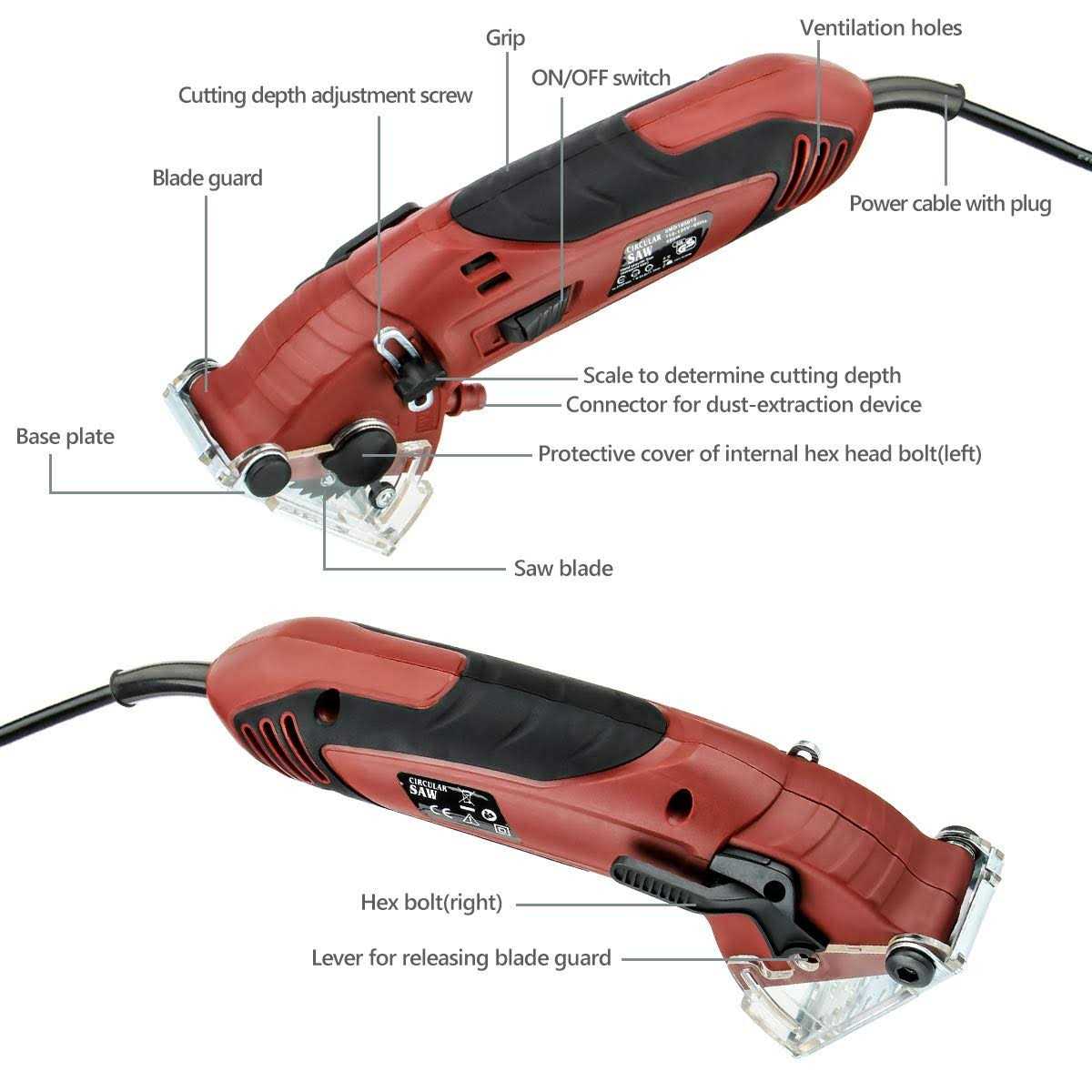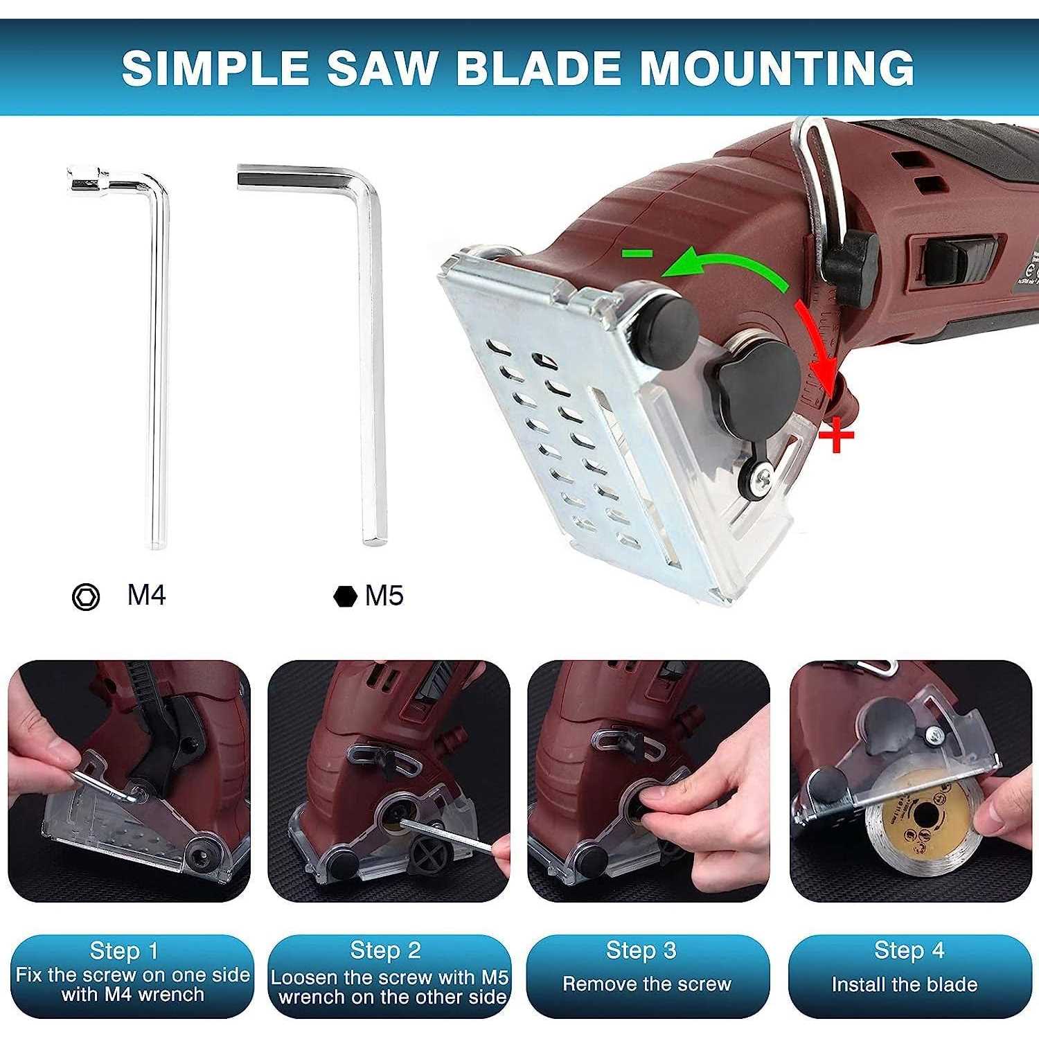 Brand: King ShowdenColor: Circular Saw Set With ToolboxFeatures: 【Quality Material】: Multi function circular saw is made of high-quality metal alloy material, with ergonomic antiskid handle and high carbon steel saw blade. Durable, small, light, powerful, sharp blade, with a special tool box. 【Powerful and efficient】: The high-performance rotary tool has powerful motor providing strong rotational power and lower noise making, with excellent mobility and portability. Fast cutting of wood, soft metal, ceramic tile, gypsum board, plastic, etc. 【Dustproof Pory and Metal Protection Design】: The dustproof port formed by the suction hose can timely discharge the cutting debris, help you clean the cutting surface, keep the cutting line dust-free at all times, and let you clearly see the cutting line. Adopt metal protection design to prevent spark injury during operation. 【Safety & Studry】: This electric circular saw blade has a suitable protective distance around it for added safety. It can also help you cut the best straight line. Compact size are perfect for narrow space and also suitable for women. 【Package Include】: Mini electric saw + 6 pcs saw blade + 2 hexagon wrenches + silica gel wire + tool box + instruction manual. High speed hacksaw blade (black) cutting soft metal, plastic, aluminum alloy. Diamond saw blade (yellow) cut ceramic tile, marble, cement. Alloy saw blade (silver gray) cutting wood. Part Number: D060003904USDetails: Product description: Professional High Powered Circular Saw High Powered Multi-Functional Saw for Cut Drywall, Tile, Metal, Pipes, PVC, Plastic, Wood, Ceramic Grout Masonry Marble Stone. It Is Most Suitable for Working In A Narrow Space Or In An Area Inaccessible To The Electric Saw for Outdoor Cutting. Specifications: Color: As the pictures show Voltage: 110V Rated power: 400W No load speed: 3400min Cutting depth: 0-12mm Cutting capacity of ceramic tile: 5mm Inside diameter of saw blade: 0.43inch Saw blade outer diameter: 2.16inch Silicone line length: 62.99inch 6pcs Blade: 2 * high speed hacksaw blade (black) / cutting soft metal, plastic, aluminum alloy and carpet. 2 * diamond saw blade (yellow) / cutting tile, marble, cement, ceramic tile, grout, masonry, marble and stone. 2 * alloy saw blade (silver grey) / cutting wood, plywood, laminated flooring, drywall, pegboard and PVC easily. Package included: 1 * Multi-function Compact Circular Saw 2 * High-Speed Steel Cutting Blades 2 * Alloy Cutting Blades 2 * Diamond Cutting Blades 2 * hex wrench 1 * silica gel line 1 * instructions 1 * toolbox (Plastic tool box)EAN: 0781545979586Package Dimensions: 13.4 x 10.0 x 4.7 inches