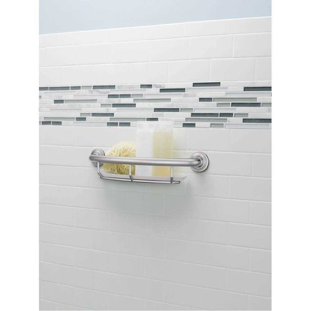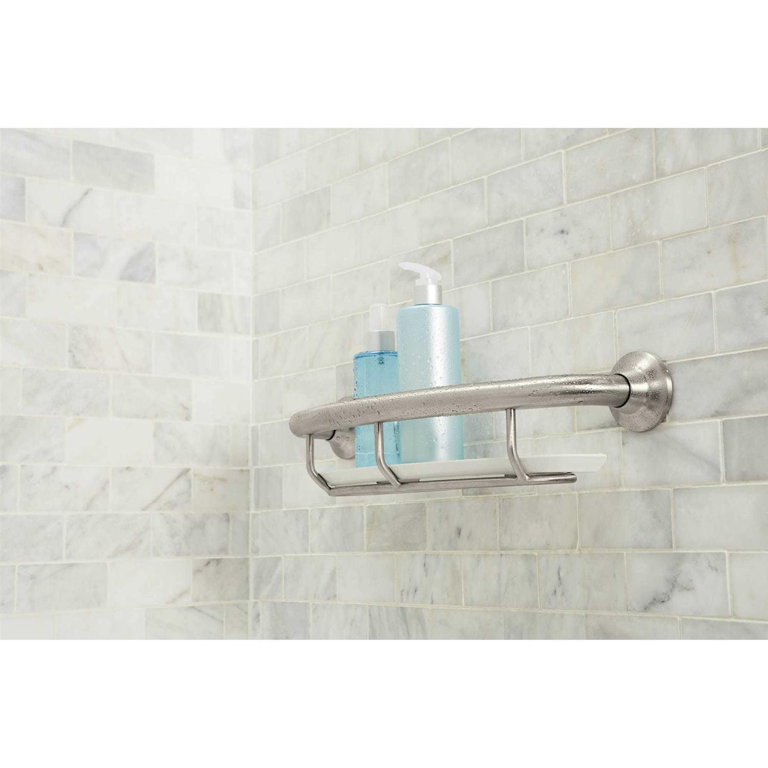 Help maintain your balance while showering and easily access soap, shampoo, and other bath products with the Moen 41cm Grab Bar with Shelf. This shower grab bar supports up to 110kg and provides a reliable handhold for bathtubs and showers. The curved bar’s streamlined design includes an integrated wire shelf and removable white tray. It also features a SecureMount design for easy, secure installation at any angle. Made from durable stainless steel, this 2.5cm diameter shower grab bar with shelf features a highly reflective chrome finish that coordinates with almost any bath decor.