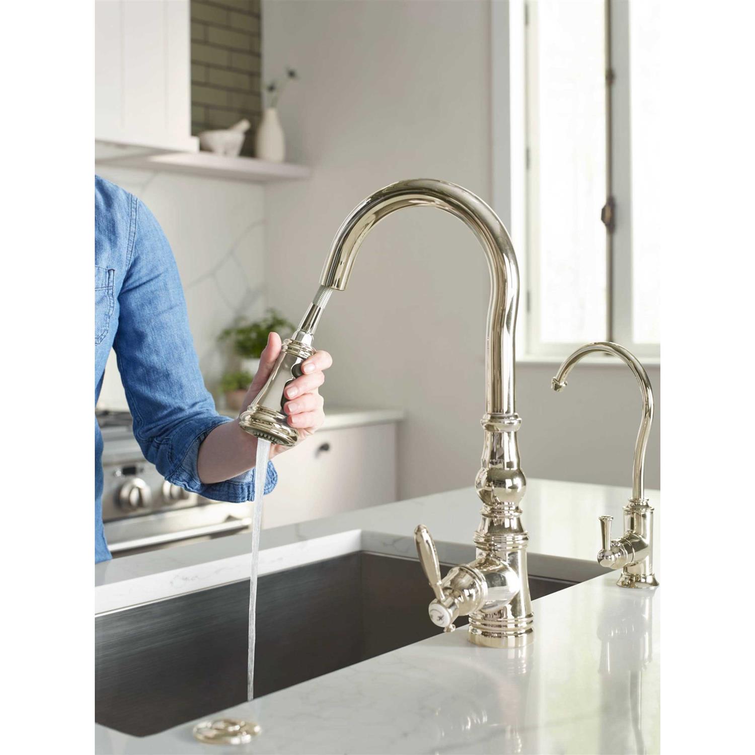 Timeless and full of charm, the traditional Weymouth pulldown kitchen faucet embodies the fresh farmhouse look consumers desire. Its distinctive accents include a refined shepherd’s spout and porcelain inlays with antiqued decorative script both in English and French to provide the ultimate in customization. The faucet features MOEN’s Power Boost technology, which provides a faster clean and a faster fill with the push of a button, as well as the Reflex system to ensure smooth operation and secure docking of the spray wand. Available in a Chrome finish.