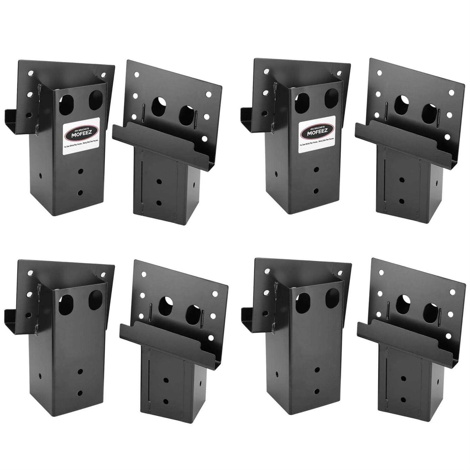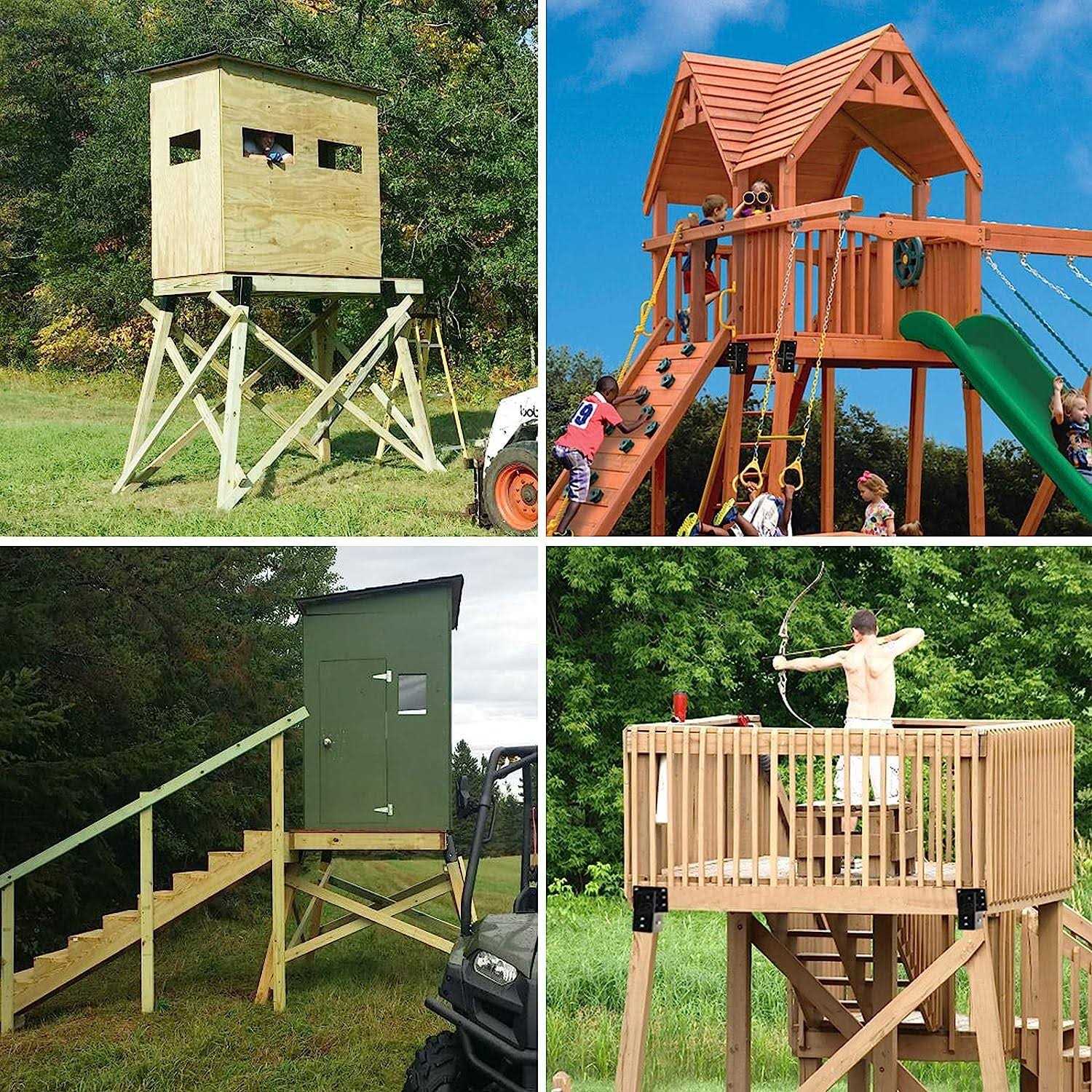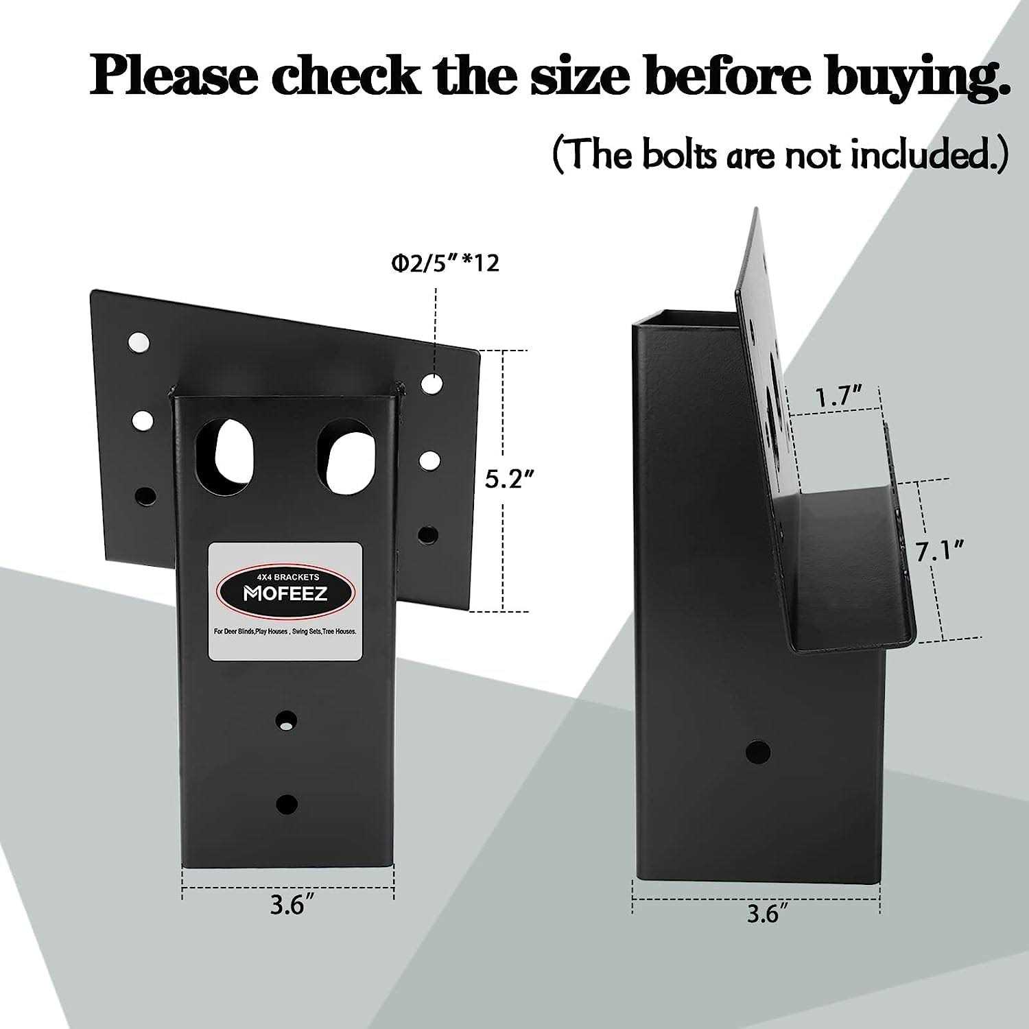 PACKAGE INCLUDED — 4x4in double angle heavy duty brackets.12 pre-drilled nail/screw holes on each bracket (screws are not included). HEAVY-DUTY CONSTRUCTION — Mofeez brackets crafted of tough, powdered-coated 13 gauge steel for durability & rust prevention; long-lasting, rugged craftsmanship for years of load-bearing performance. MULTIPLE USES — Works great for securing legs to deer hunting box stands.Most commonly used to outdoor platform,shooting platform, shooting shack,deer hunting stand,play sets,tree house,etc.Use with straight 4×4 legs.